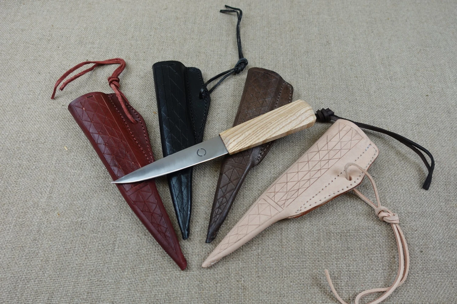 11th-14thC , Low status, Wood handled eating knife. An Ash handle with a stout blade suspended in an early style vegtan, leather sheath making this perfect for late 11th – 14thC.
