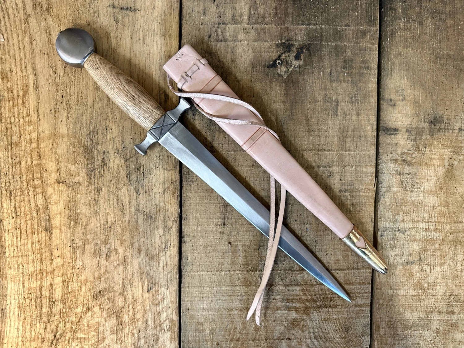 12thC Medieval Quillon dagger – daggers started as knights daggers in the high medieval period and quickly became popular with regular soldiers and men at arms. This medieval dagger is an early version and was the height of fashion in the 12thC and features a stout double sided blade fitted to a simple steel guard and pommel with an Ash wood grip. Stylistically they are similar to swords of the period and this example is based on an English piece, but this style of dagger fits all over Northern Europe.ย
