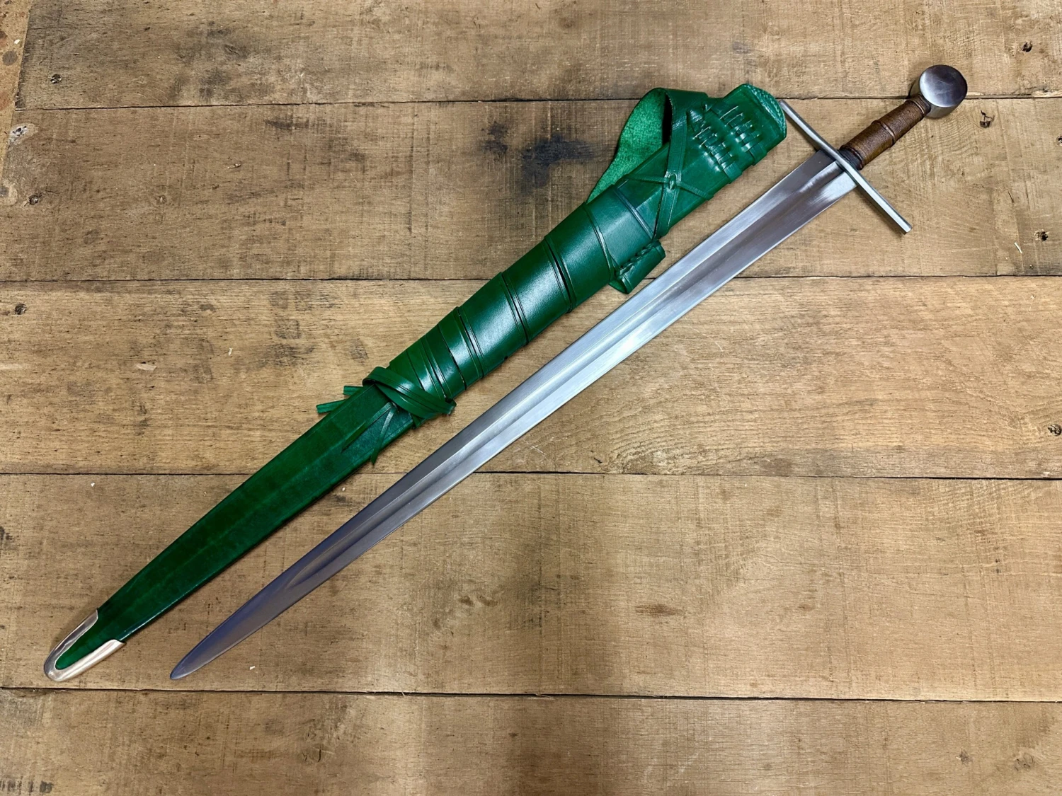 Built for cutting, but with a relatively long 79cm blade and sharp point, this is a formidable sword and was exactly of the type favoured through the early periods of the crusades and the endless low level warfare across most of Western Europe. The hand forged sword is made from 1060 spring steel.