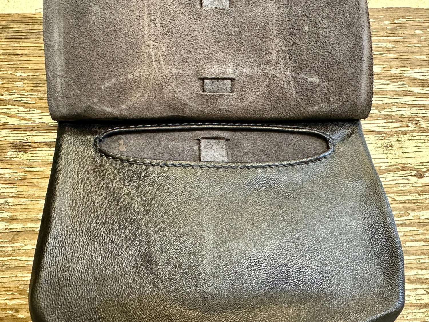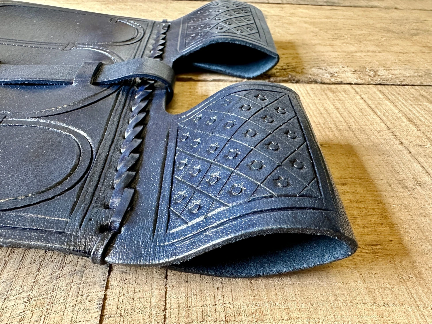 14th/15thC leather belt pouch with incised decoration and thong work to the front. Soft leather liner with a stitched hand opening a bit smaller than the width of the bag to put off those pesky cut purses and dippers.ย