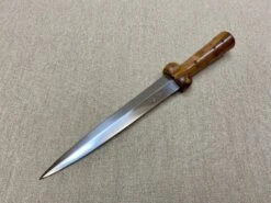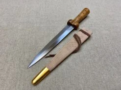 This medieval bollock dagger is a composite from a few sources and has a double edged blade with an asymmetric grind and a wooden handle decorated with the ever popular ‘dot and circle’ design and finished off with a brass peen washer.