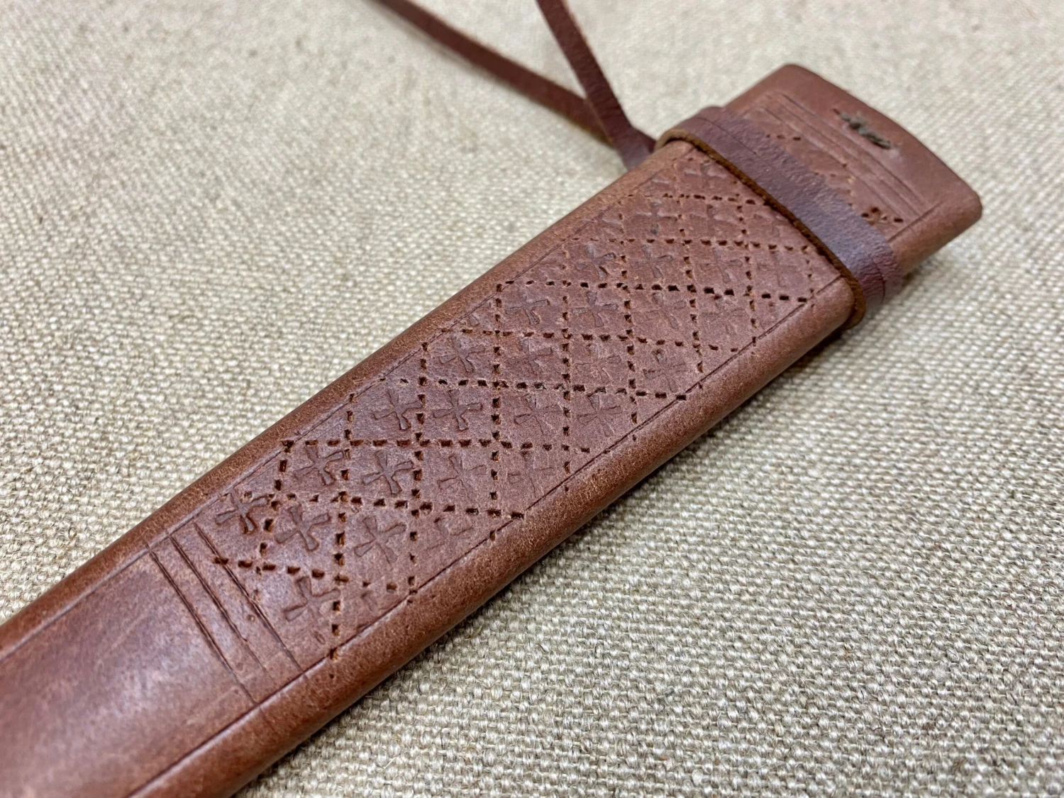 The sheath is a double layer veg tan construction and decorated with incised and punched patterns and finished with a fabricated brass chape.