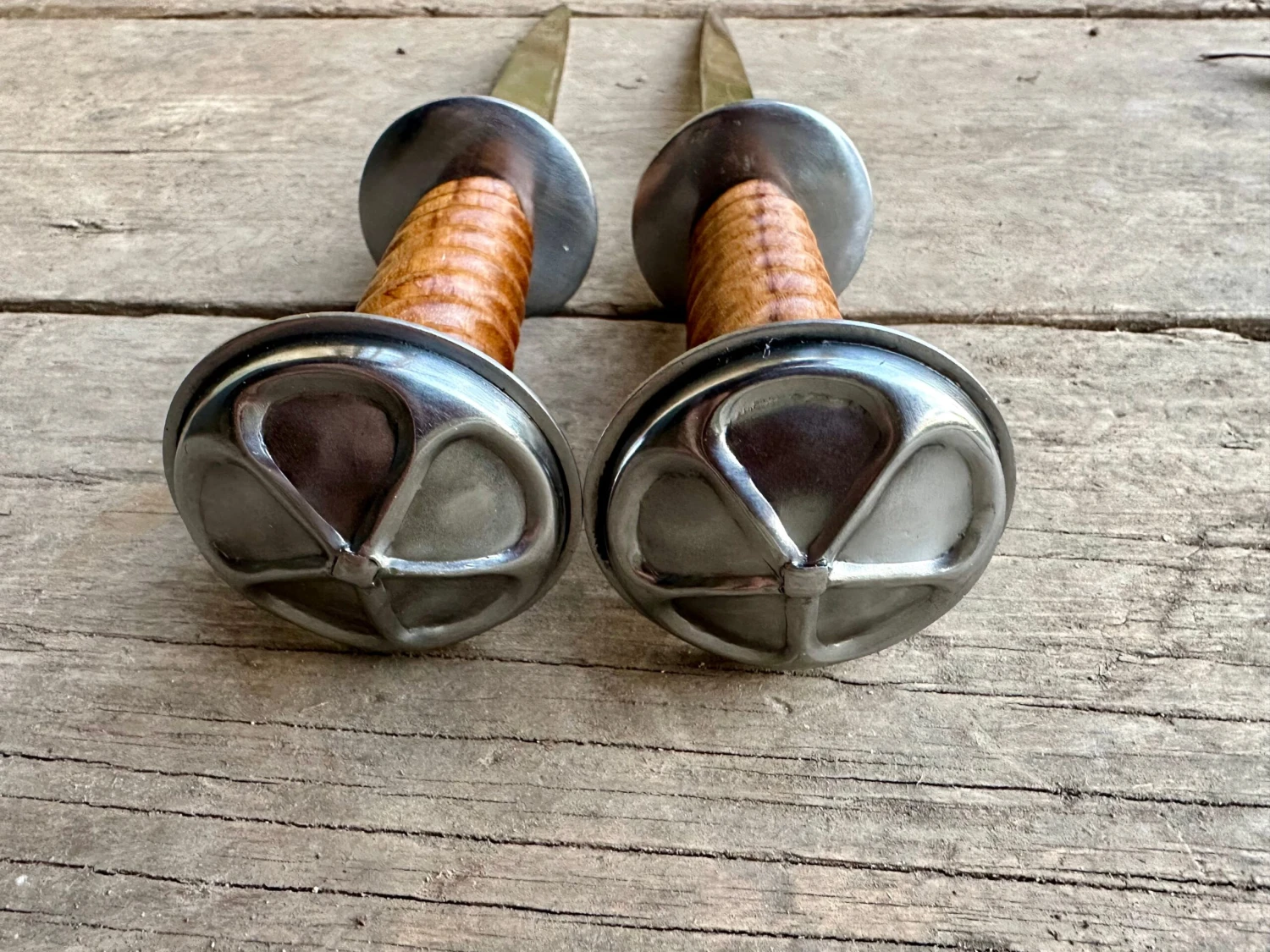 Steel brazed rondels, wooden grip, thick carbon steel blade.ย Veg tan leather sheath.