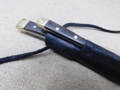 The medieval eating set comes in a double layer veg tan leather sheath with individual pockets for knife and pricker.