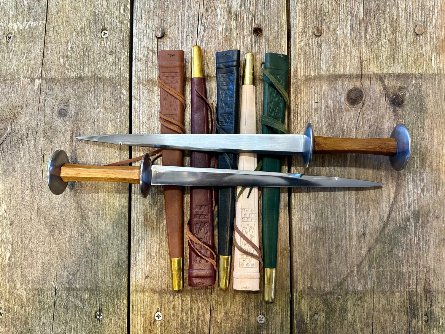 Steel brazed rondels, wooden grip, thick carbon steel blade. Veg tan leather sheath.