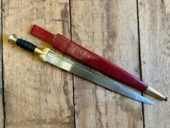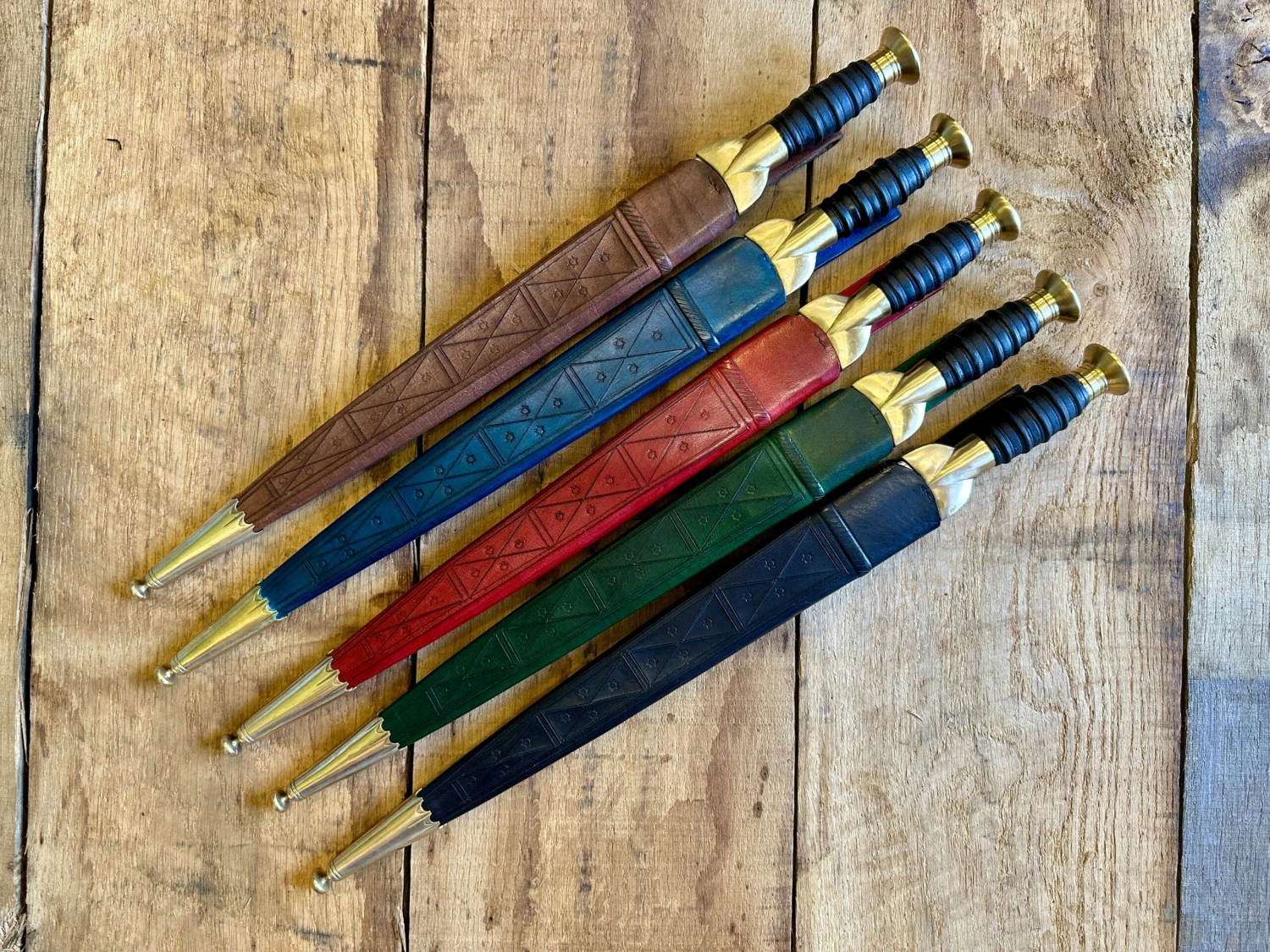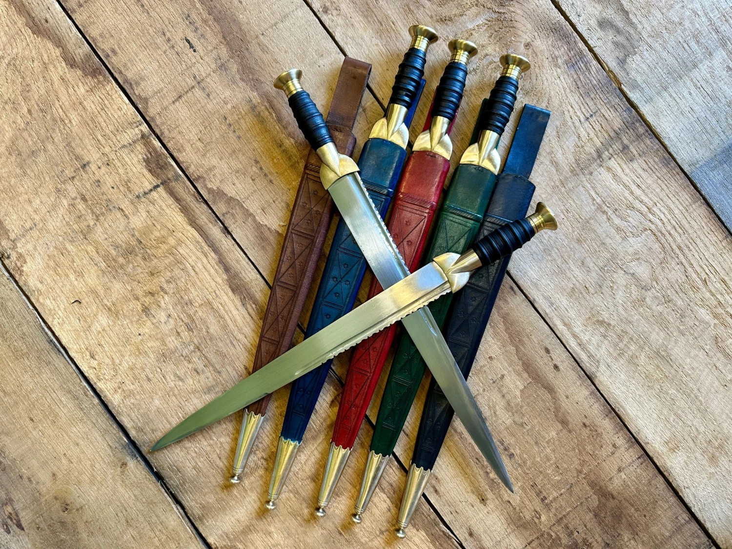 It has a fully functional, 13″/33cm single edged blade with file work spine and comes with a with a period appropriate decorated naturally tanned leather sheath and brass (latten) chape. Available in black, brown, red, green and new blue.ย