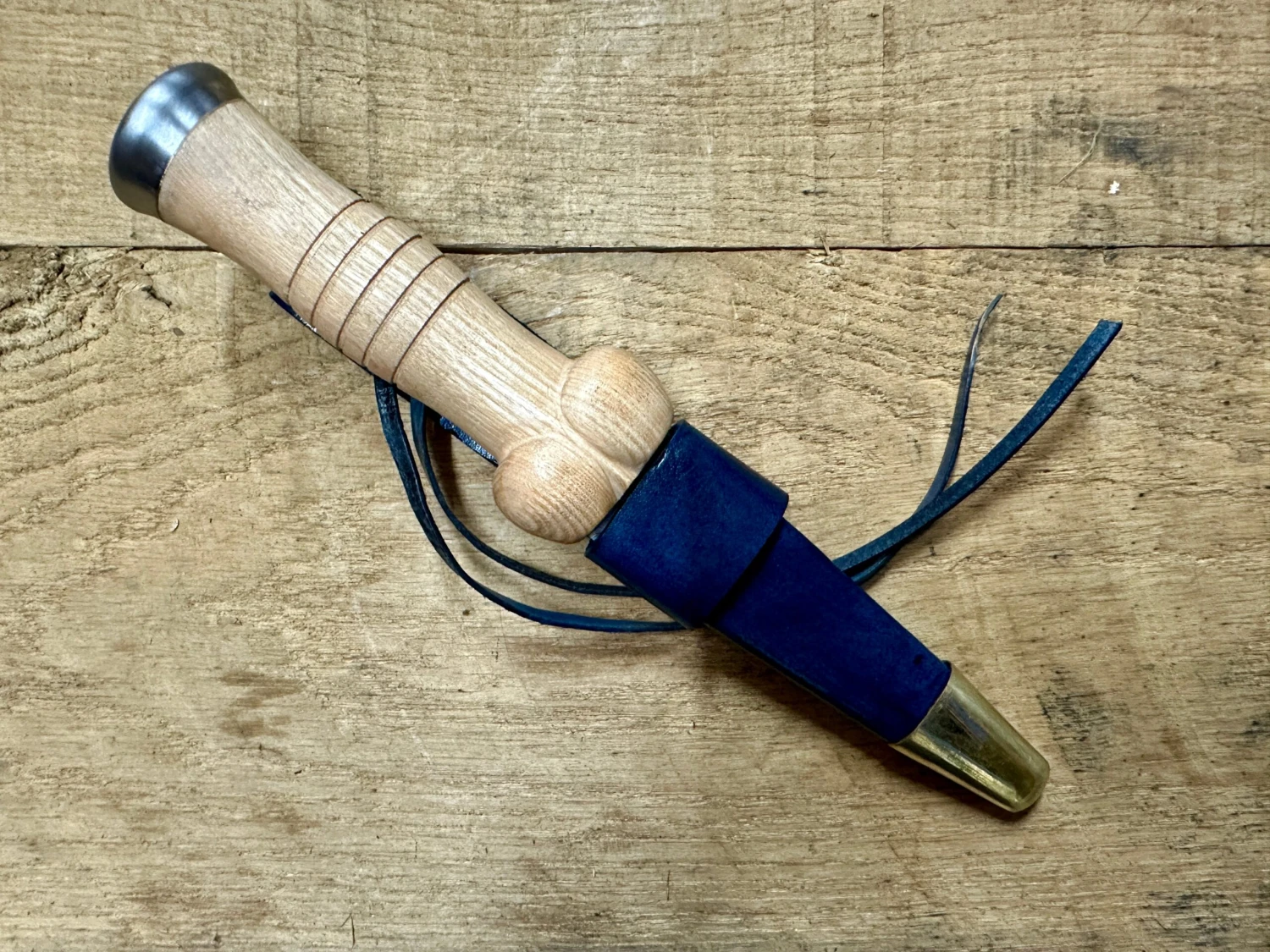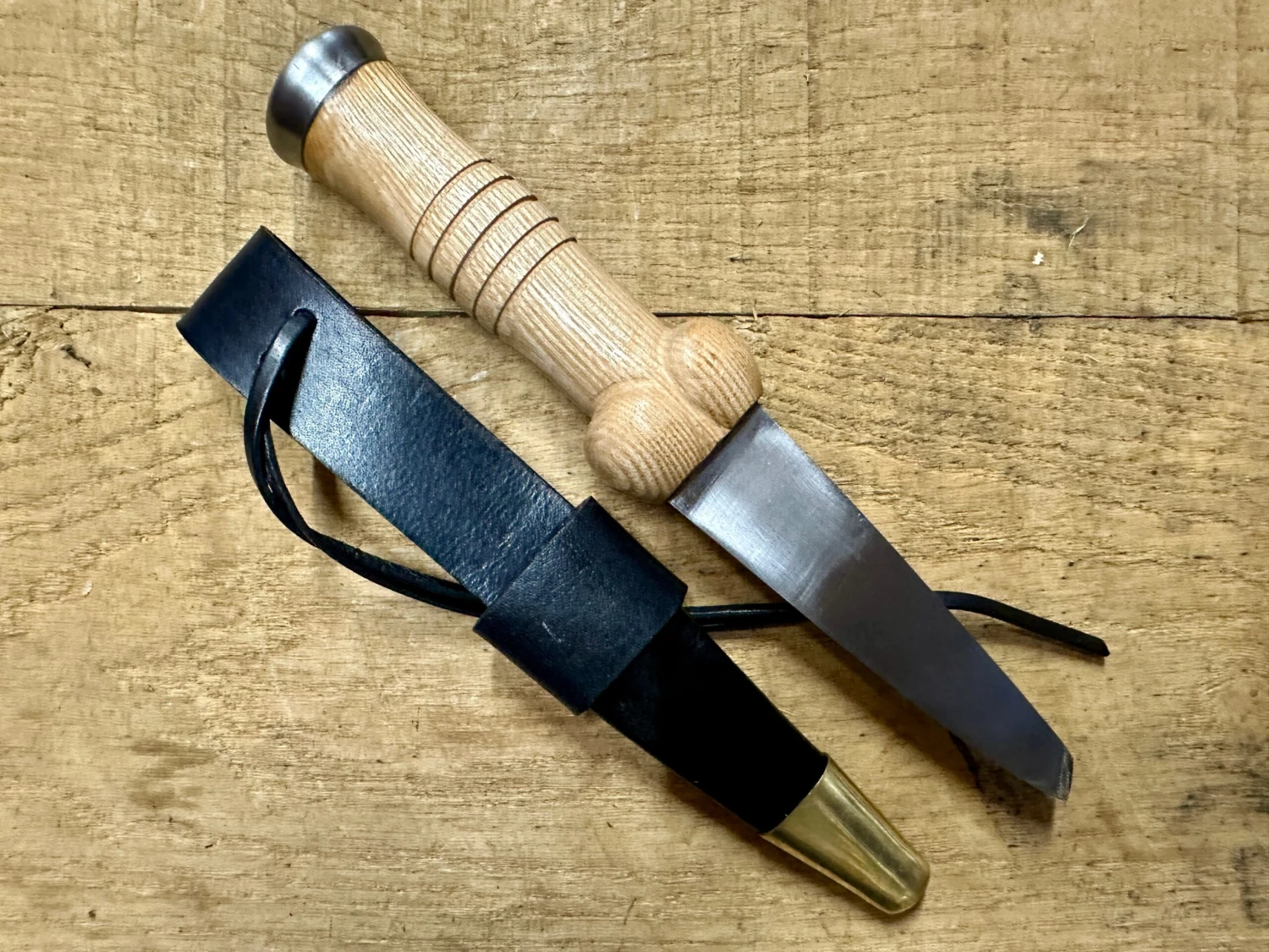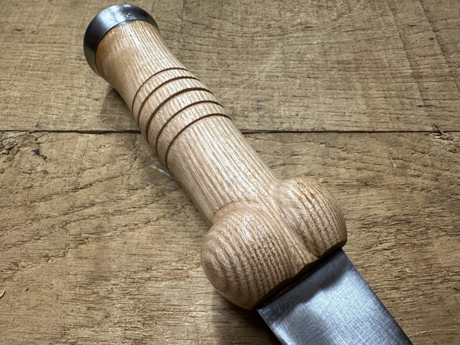 The blade is 7mm thick and fitted with a wide tang into an ash grip with a steel pommel cap, it is certainly tough enough to help extract arrows by levering or even pounding on the pommel with a handy log or mallet.