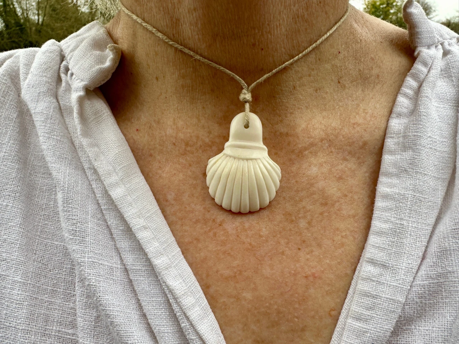 This carved bone shell was based on a Thames find and can be sewn onto clothing or worn as a pendant with the addition of a piece of cord or chain (not included).