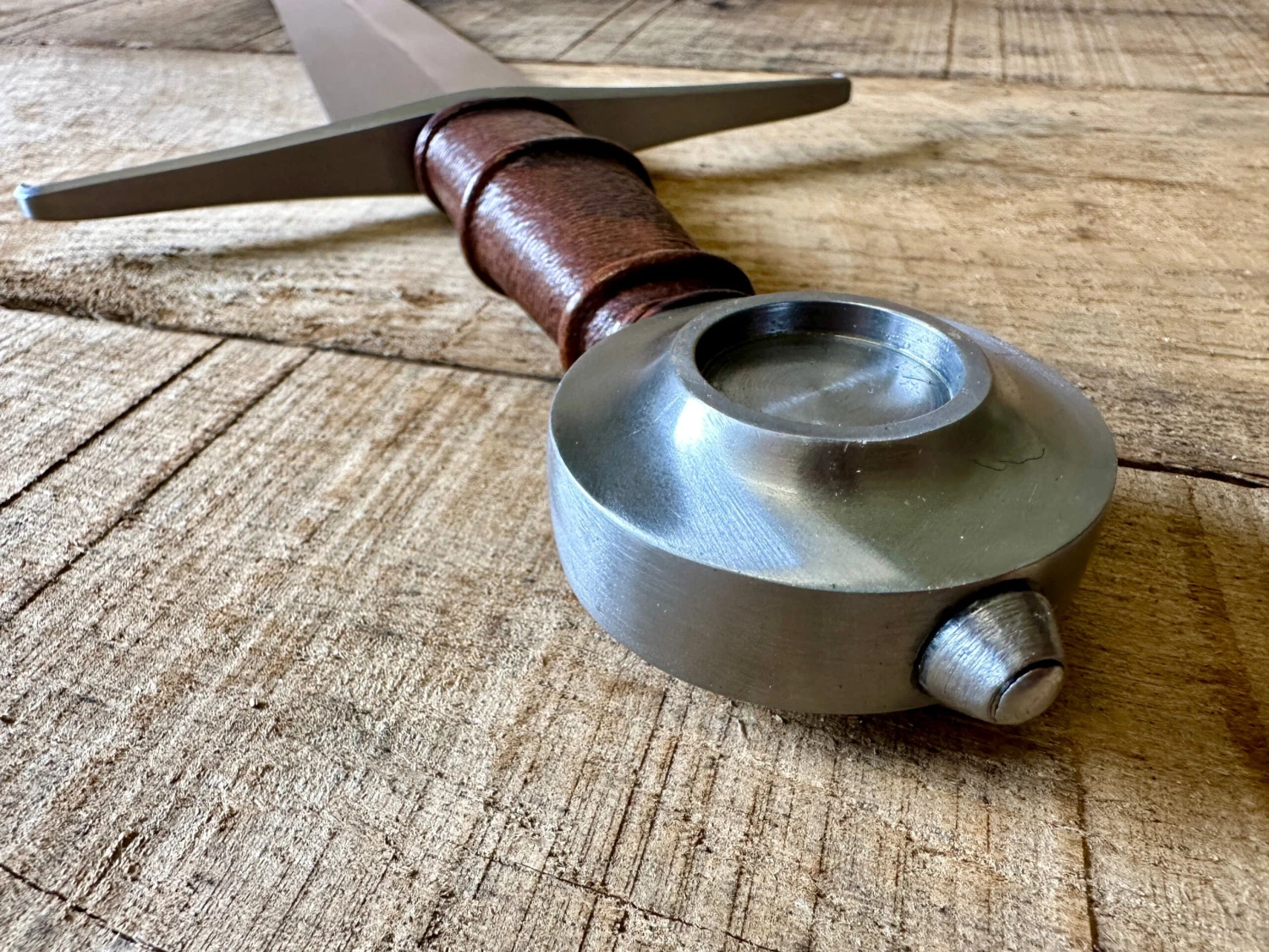 This medieval replica sword was a popular type through most of the 15th Century, and is particularly associated with Castillon after a case of 80 swords was recovered from the Dordogne River in 1973. This Type XV sword with its very pointed hollow ground blade was specialised for finding the gaps in armour and this replica will do that perfectly with its needle sharp tip and stiff prominent spine. The wheel pommel, Type XV blade and straight guard with downturned tips makes the Castillon sword iconic.