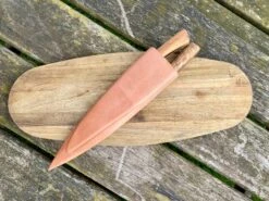 Carbon steel blade, wooden grips and a veg tan leather sheath for safety.