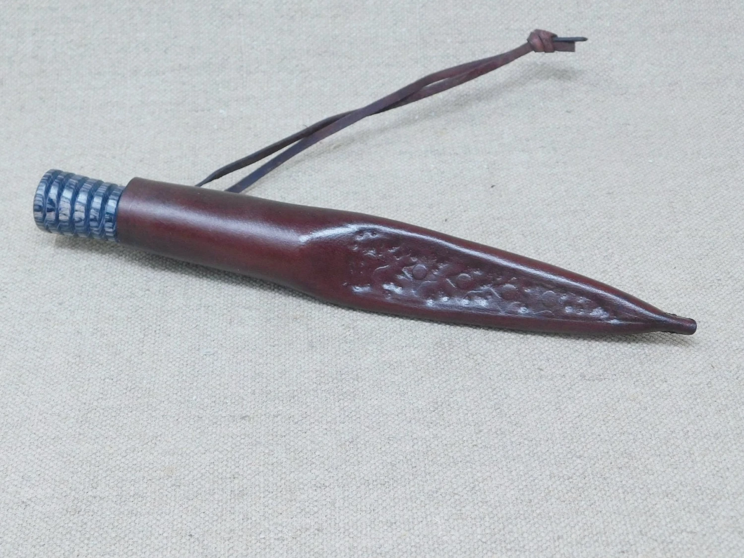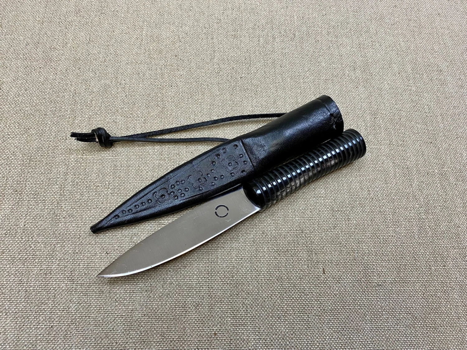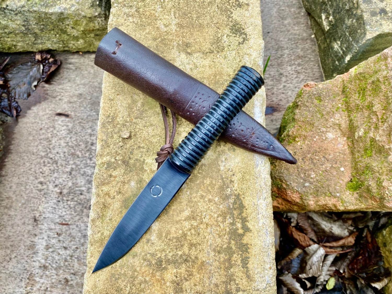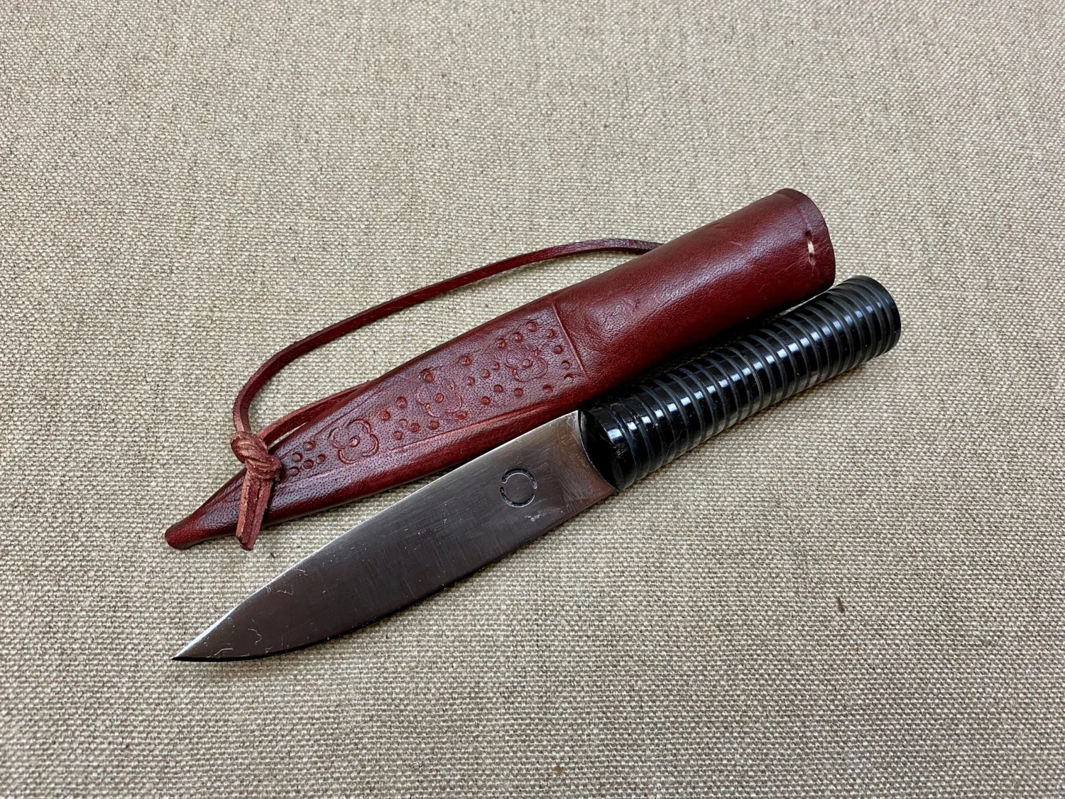 Turned horn handle, carbon steel blade and veg tan leather sheath.