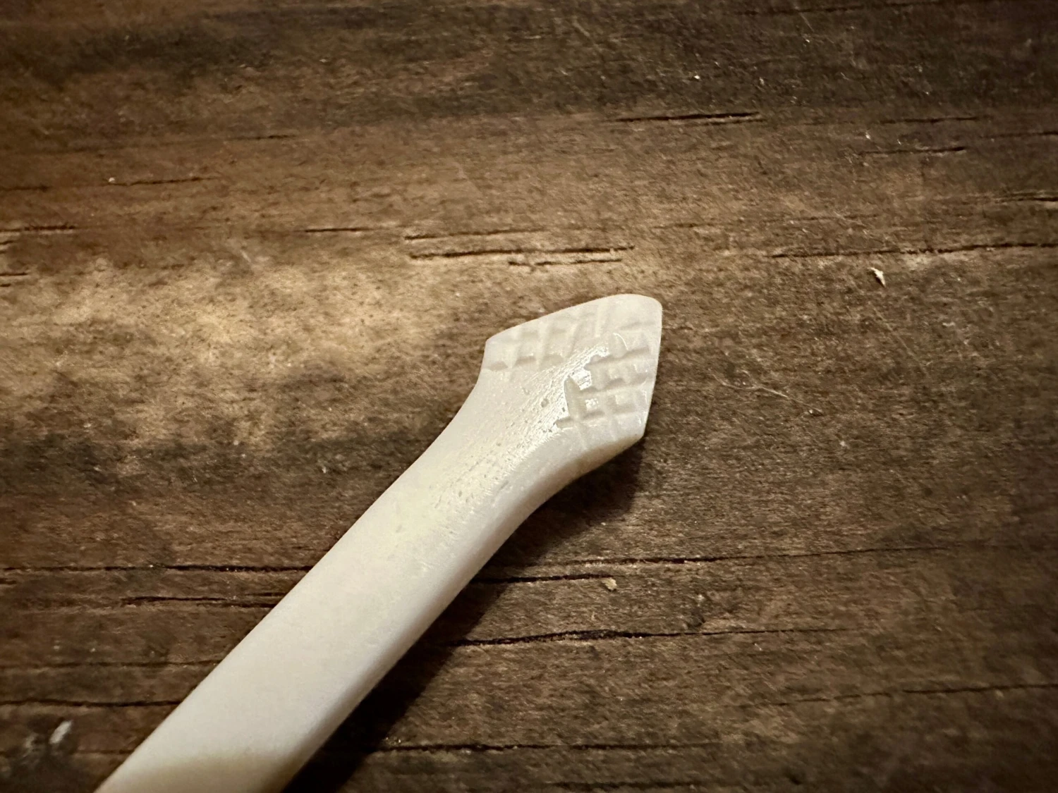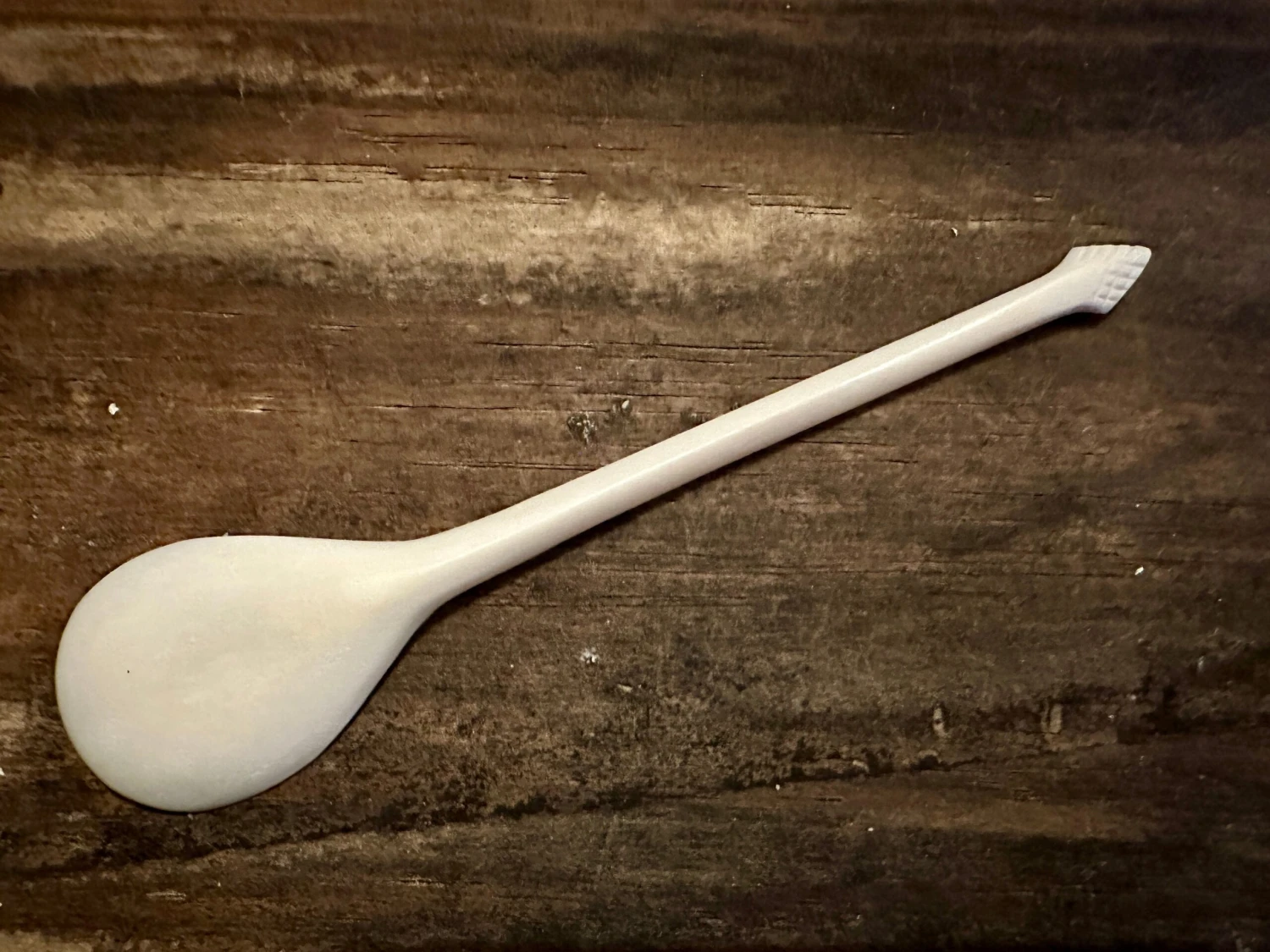 This medieval carved bone spoon is based on a piece found in the river Thames and is dated to the 14th to 16thC and features a simple feather carving on the finial.