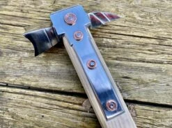This beautifully devastatingย example can be purchased unmounted or mounted on a fantastic, shaped ash shaft with a steel end cap. All riveted together with steel rivets and decorative bronze rivet washers and looking, and assembled just like the original.ย