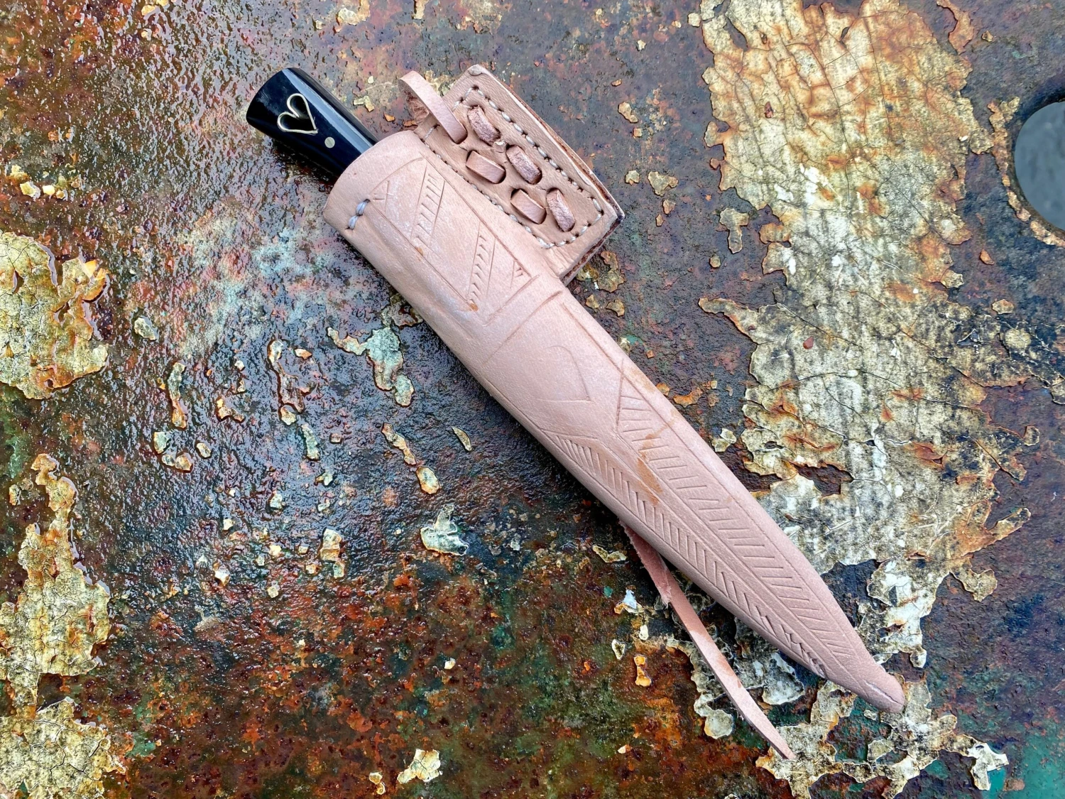 This medieval eating knife is based on a composite of historical examples from the 14thand 15thC. The carbon steel blade is stamped with a makers mark and has a carved brass bolster and black horn grip scales, notably punched through with a cut out heart lined in brass.