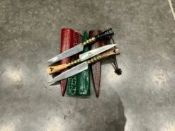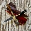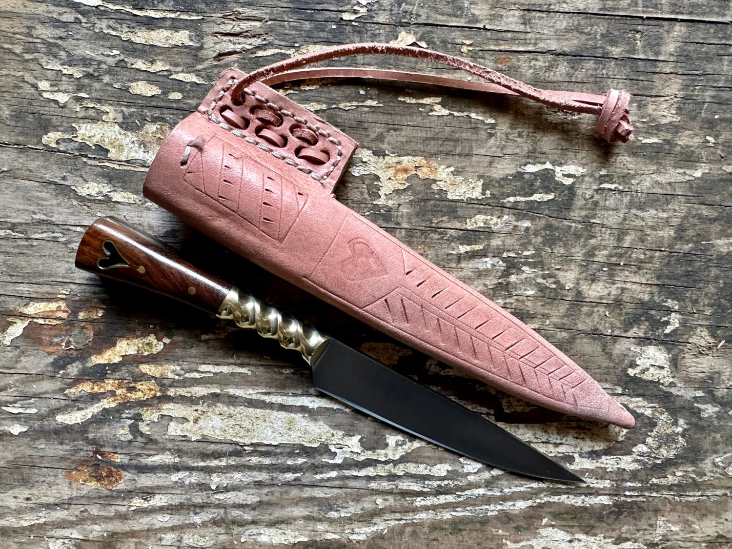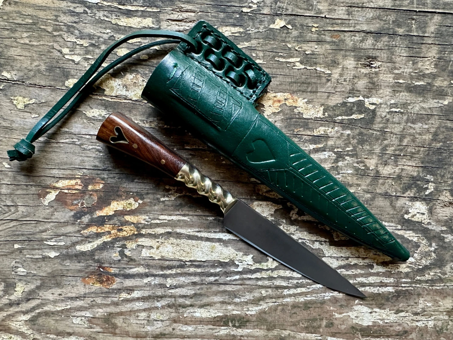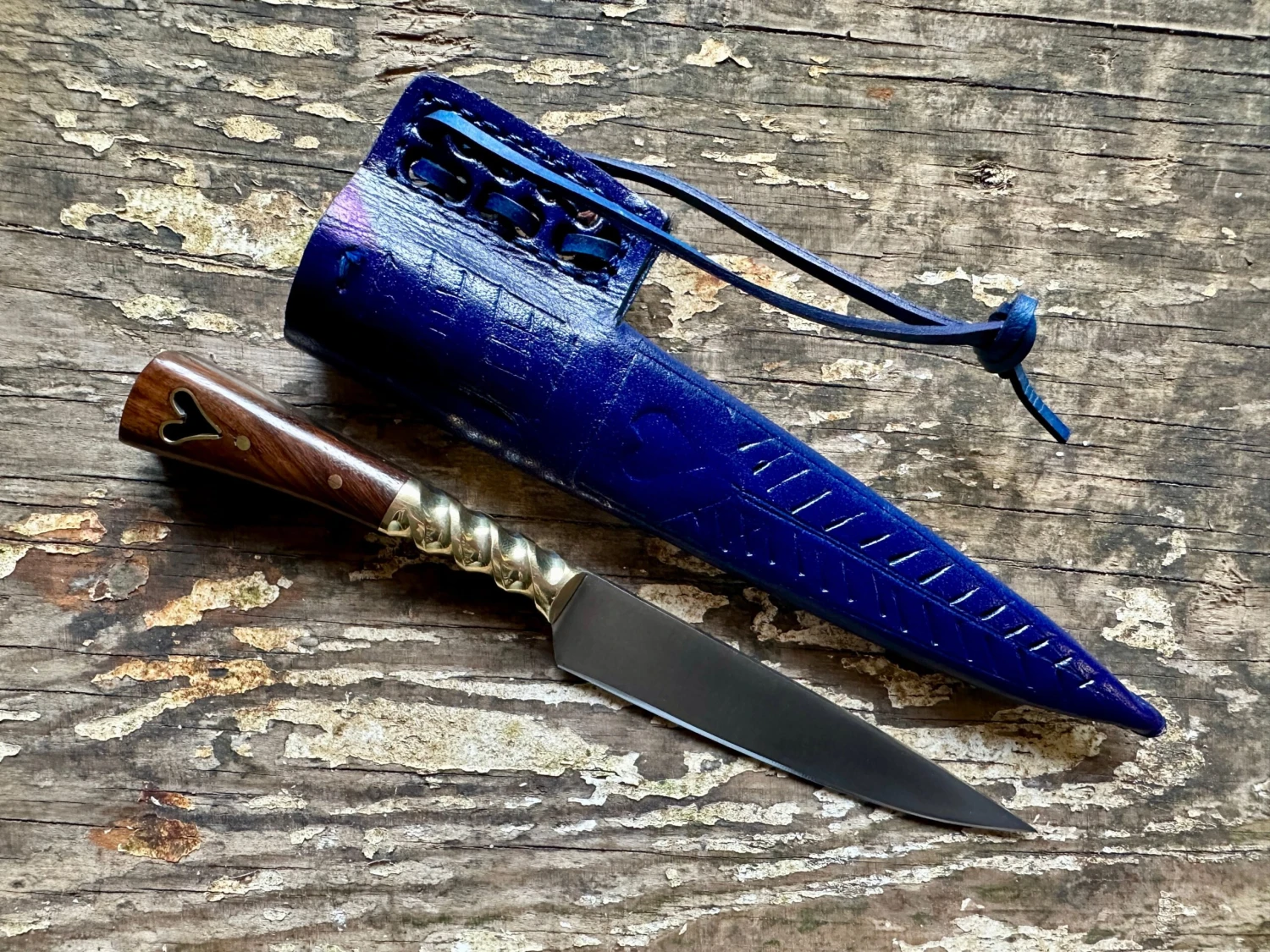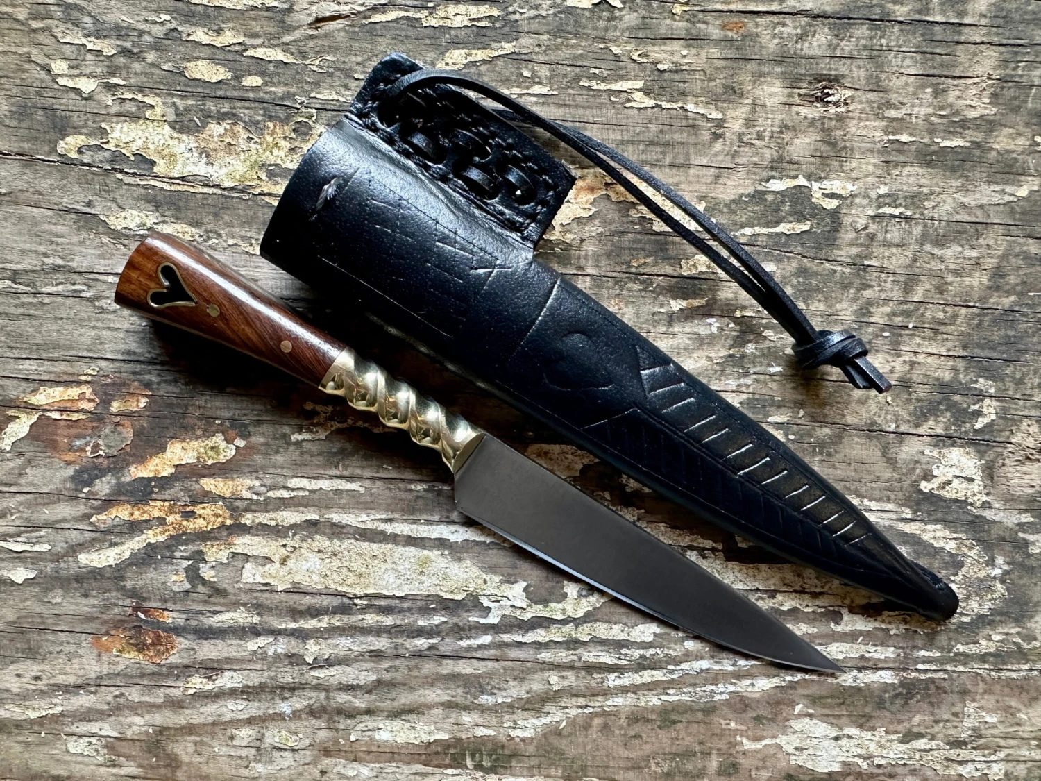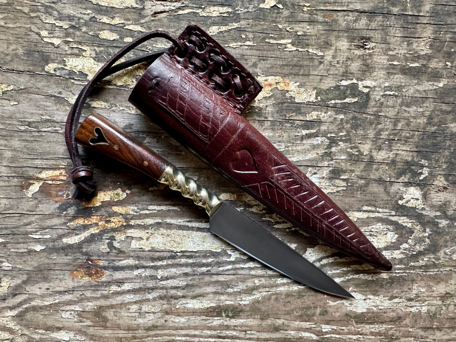 This medieval eating knife is based on a composite of historical examples from the 14thand 15thC. The carbon steel blade is stamped with a makers mark and has a carved brass bolster and dark wood grip scales, notably punched through with a cut out heart lined in brass.