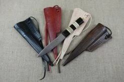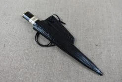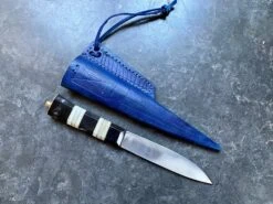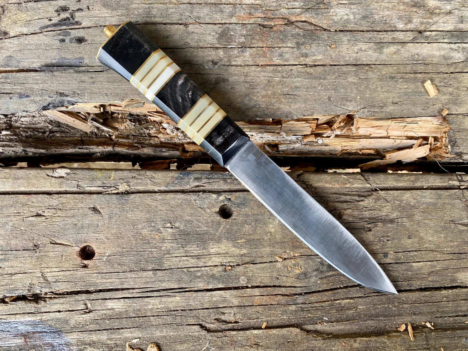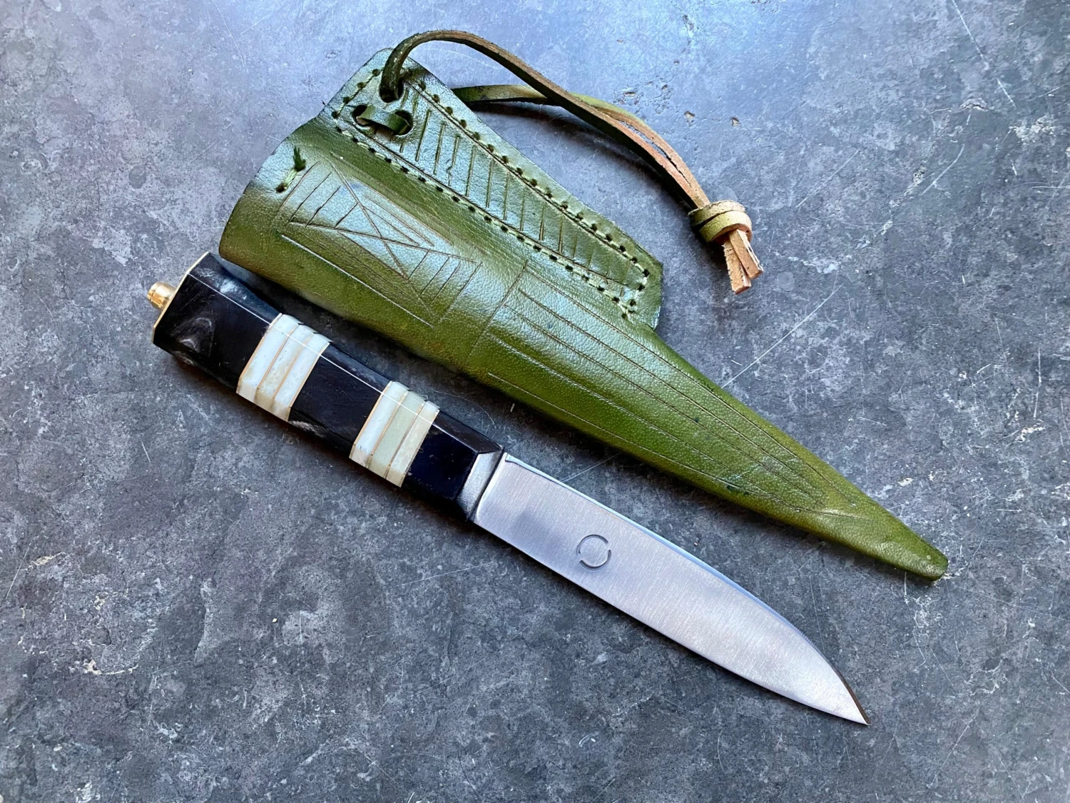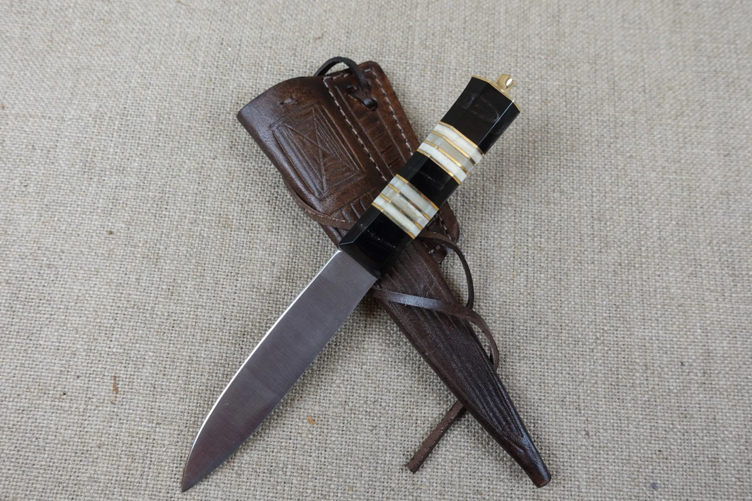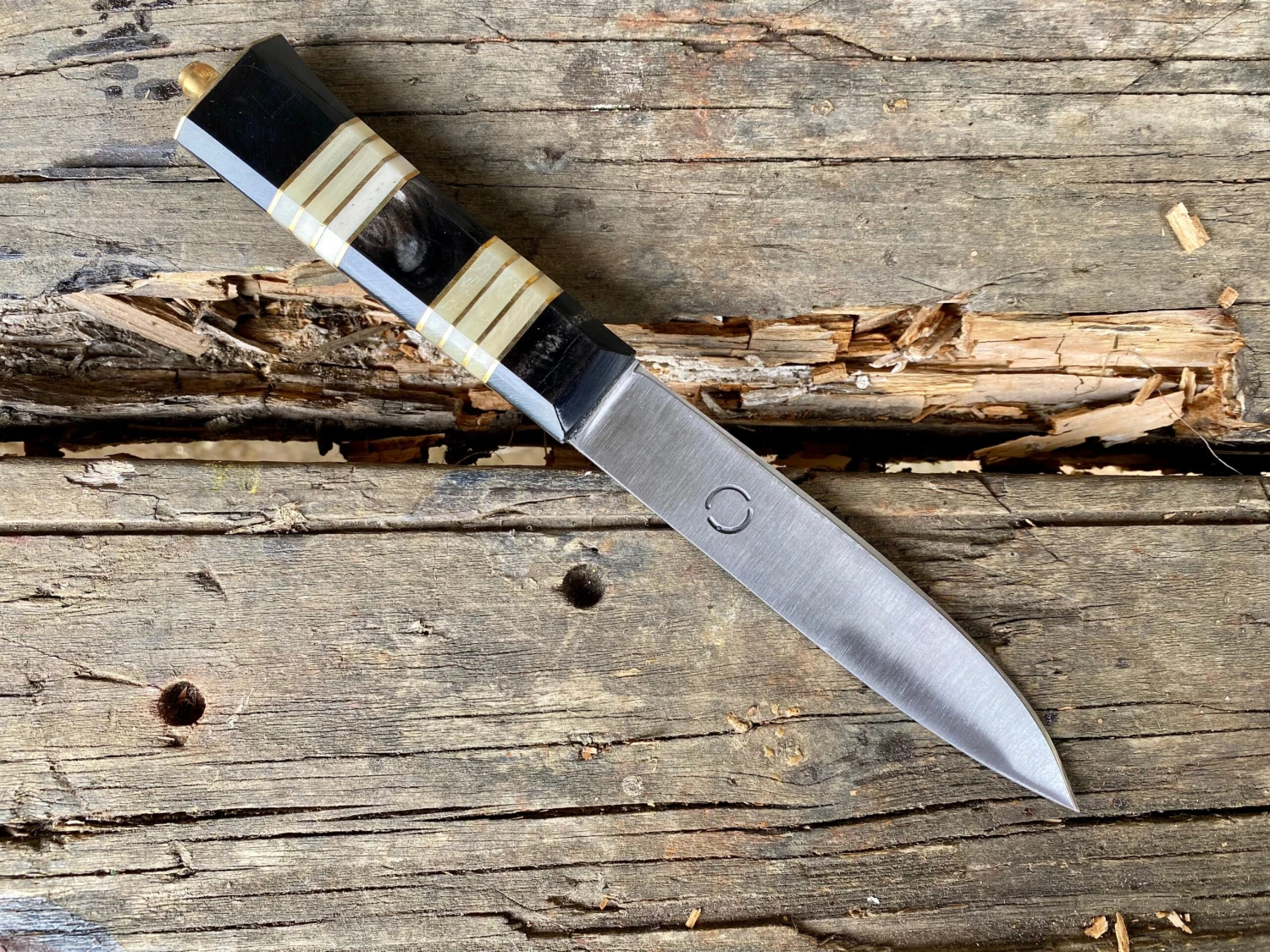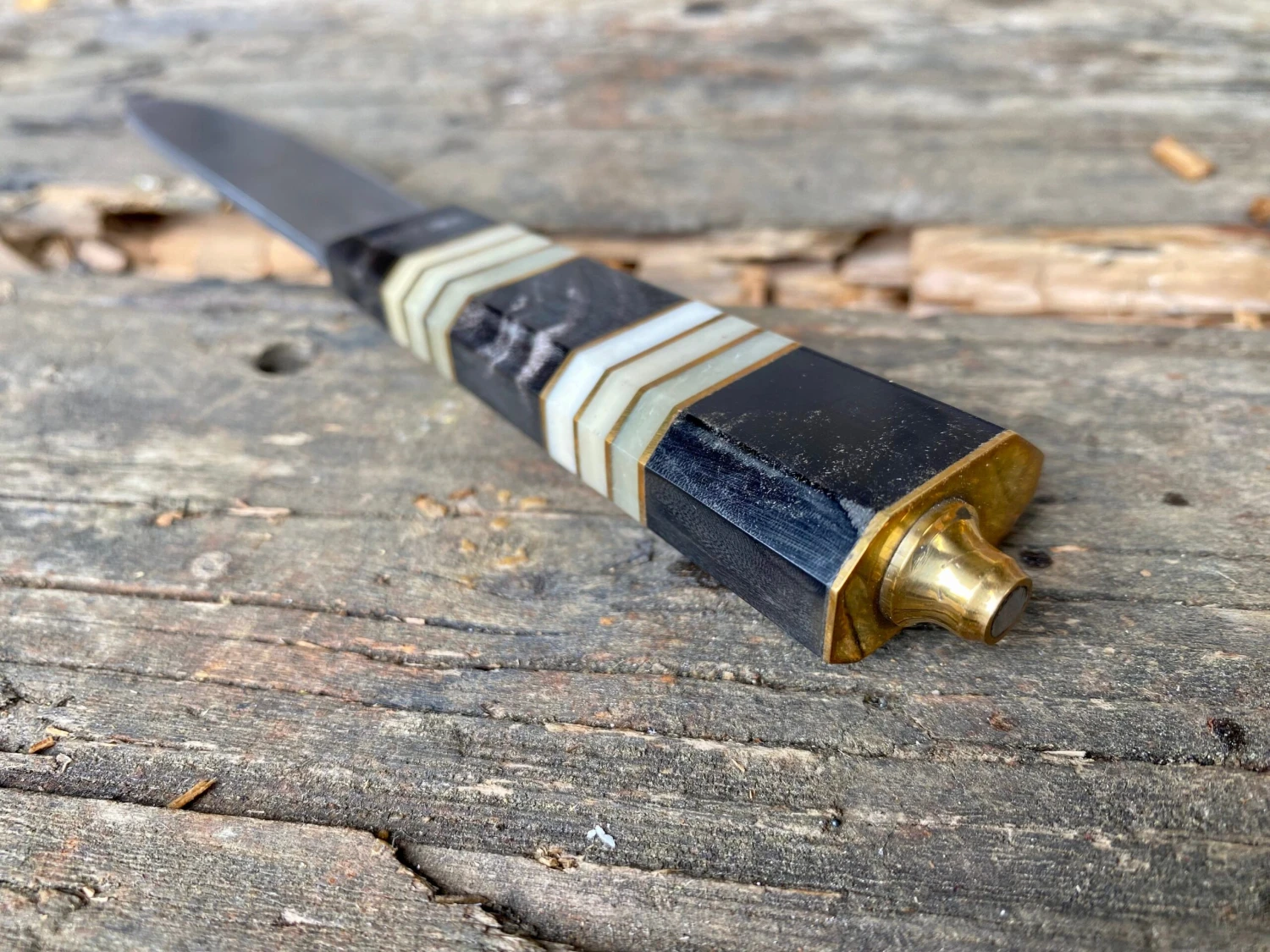 Horn and Bone Layered Medieval Eating knife 14thC-15thC. This is a very striking middle class medieval eating knife that could be mistaken for high status. In fact the layers are a lowly, brass, bone and horn, so this is firmly middle class but a very pretty eating knife.