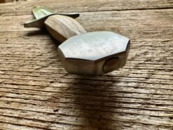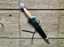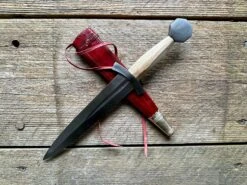 The steel hilt components are fitted to an ash wood grip and the dagger comes with a double layer naturally tanned leather sheath fitted with a decorated latten (brass) chape.