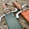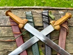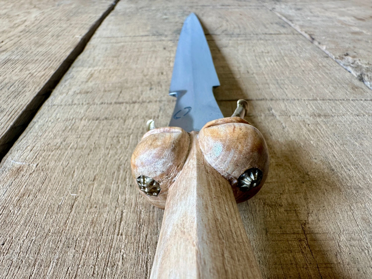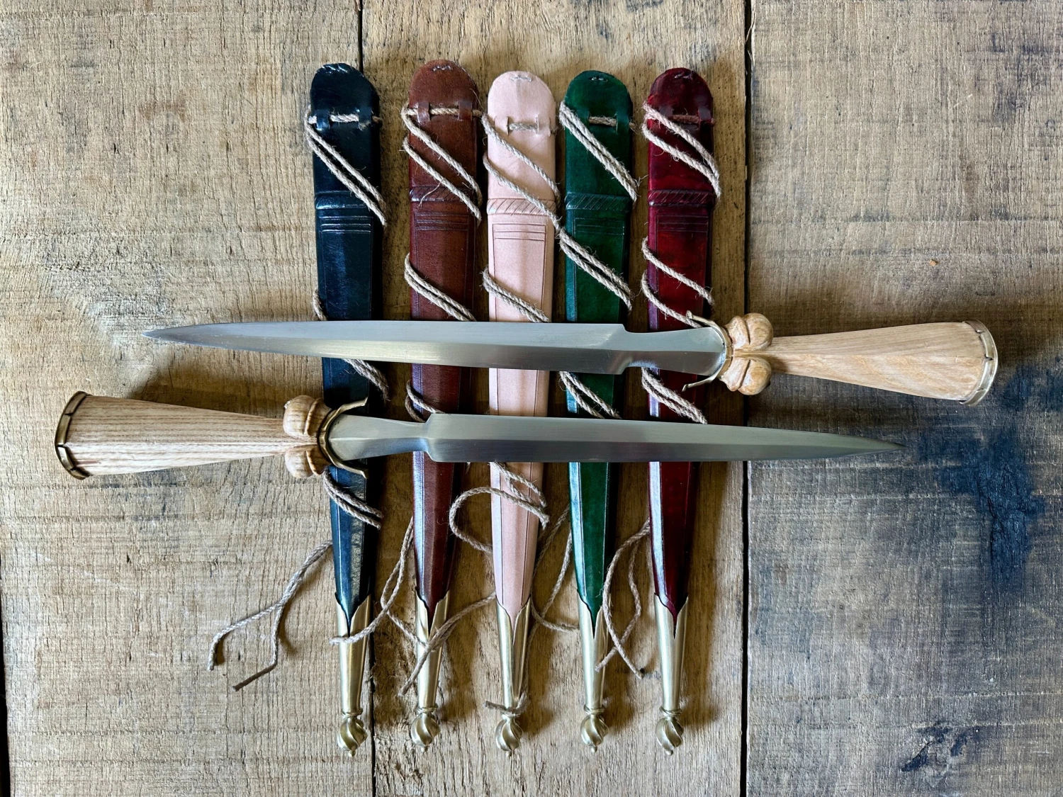 Mid to high status late 15thC bollock dagger based on a piece in the Rothenburg collection. Rounded square form ash handle with decorative rivets through the top of the lobes and latten (brass) guard and pommel cap. 28cm/11inch double sided shouldered blade housed in a double layer naturally tanned leather sheath with simple incised decoration and finished with a latten chape.