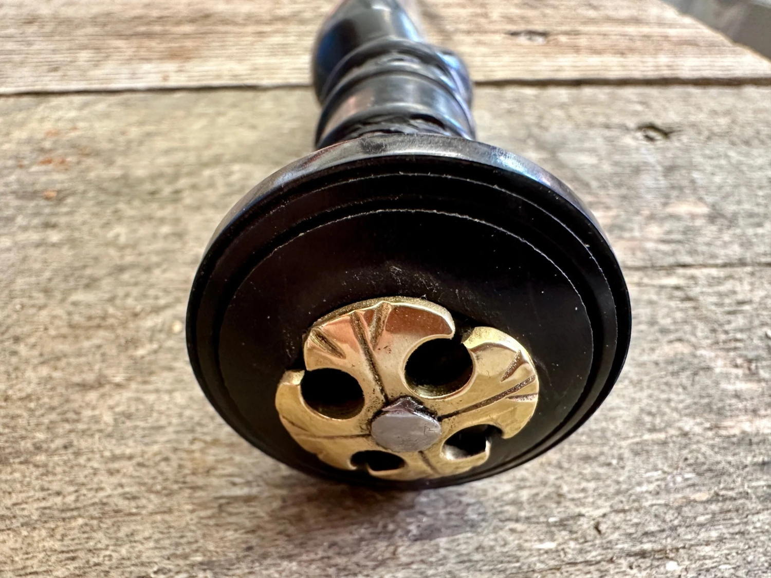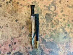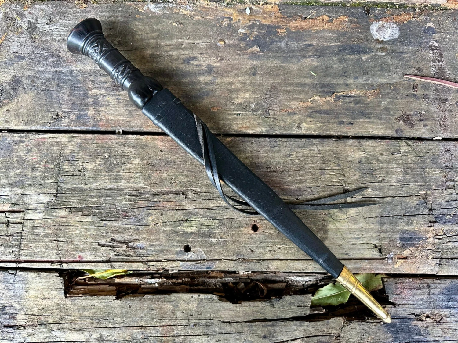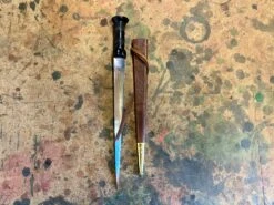 This dagger follows a classic form and is an example of one carved in black wood and comes with an almost triangular blade, again a feature of this classic style; single edged with a partially sharpened false edge.ย ย