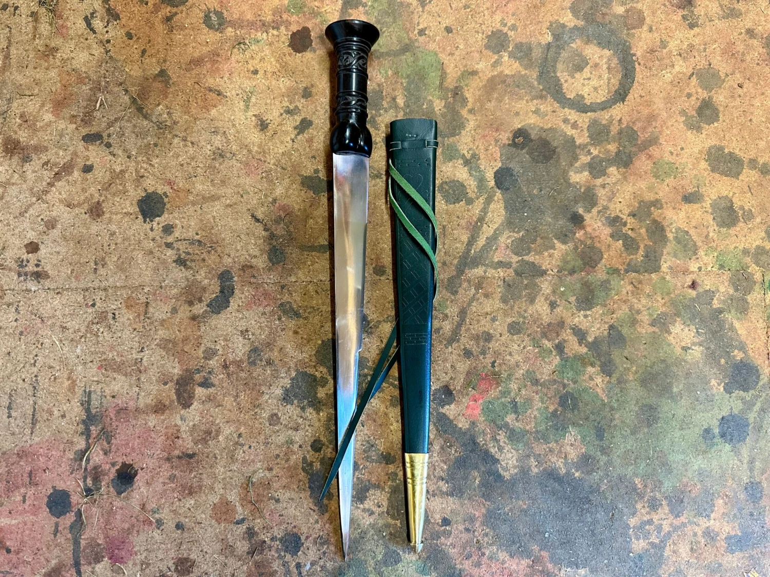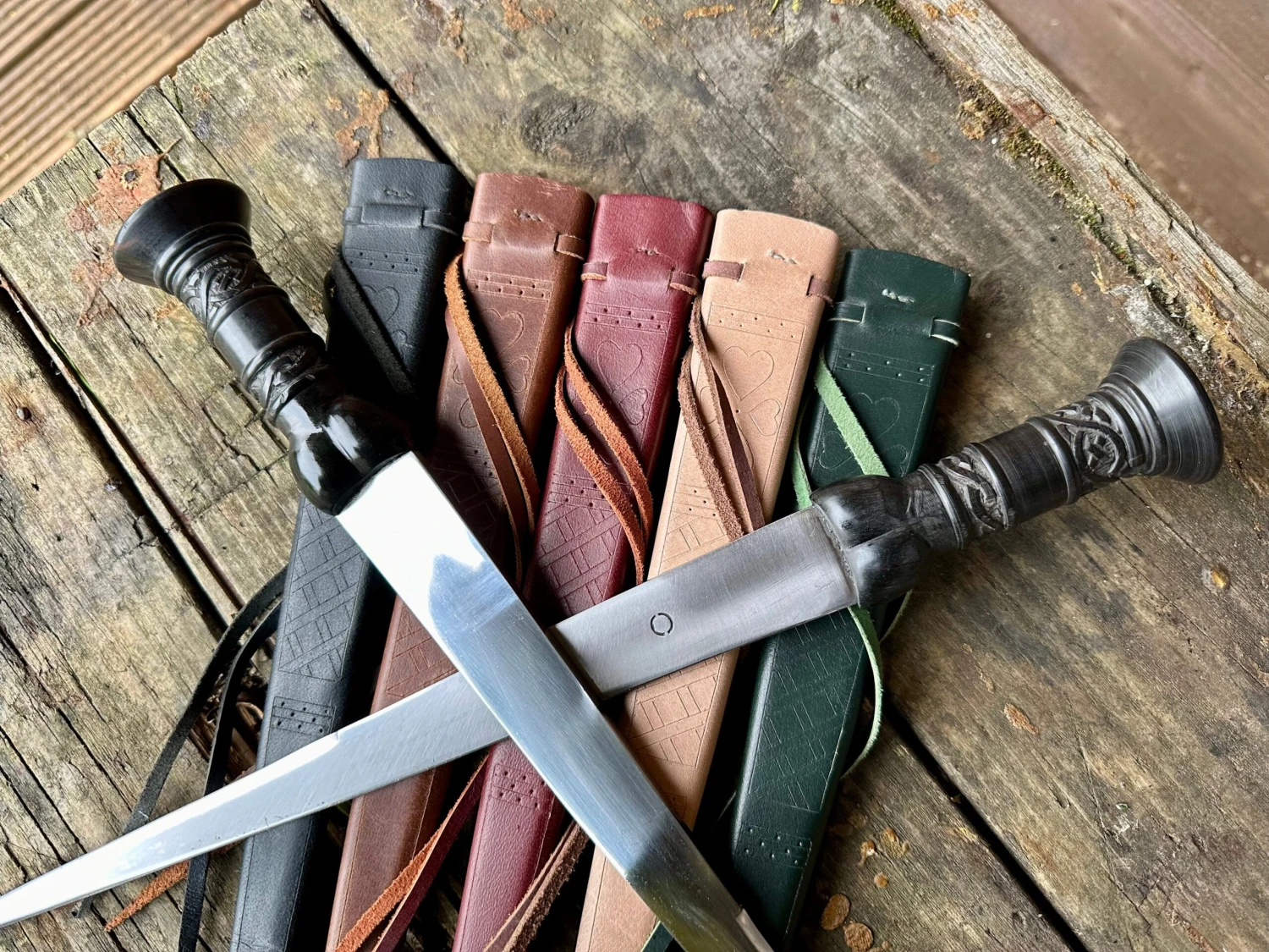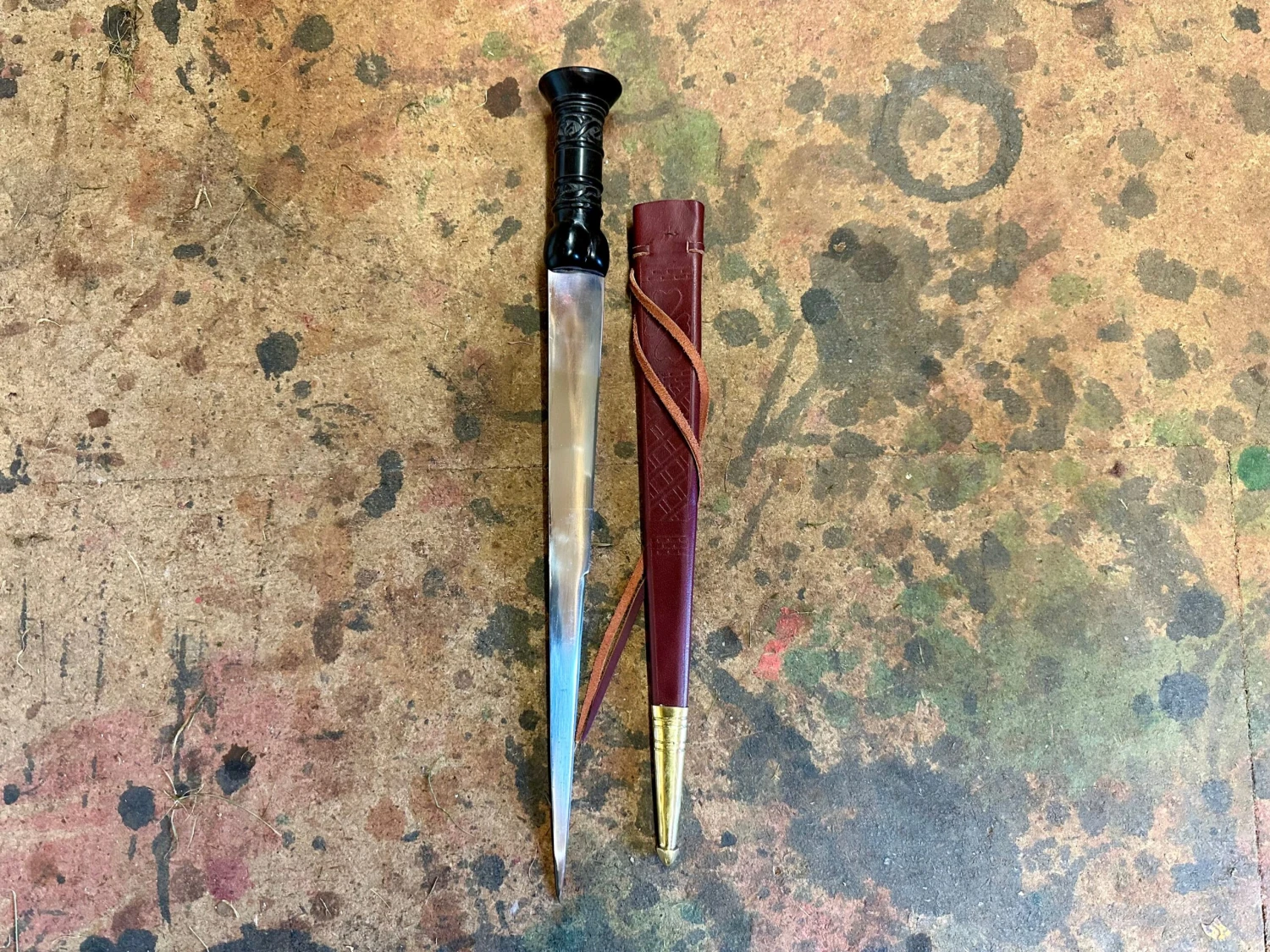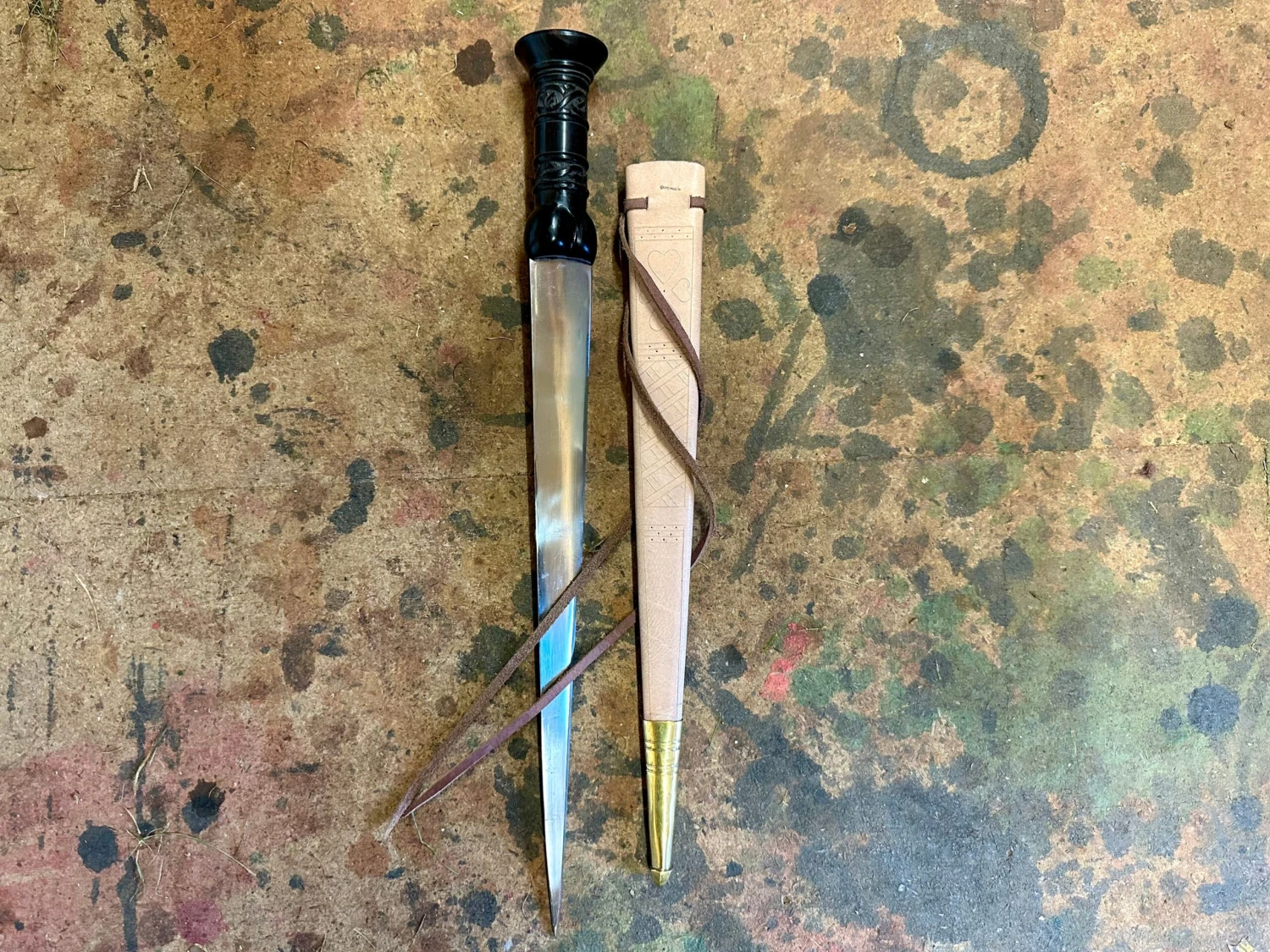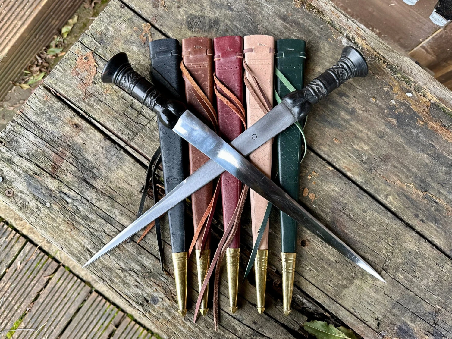 The dagger comes with a double layer leather sheath with a choice of sheath colour (Black, brown, red, green, natural) some incised decoration and a decorated brass chape.