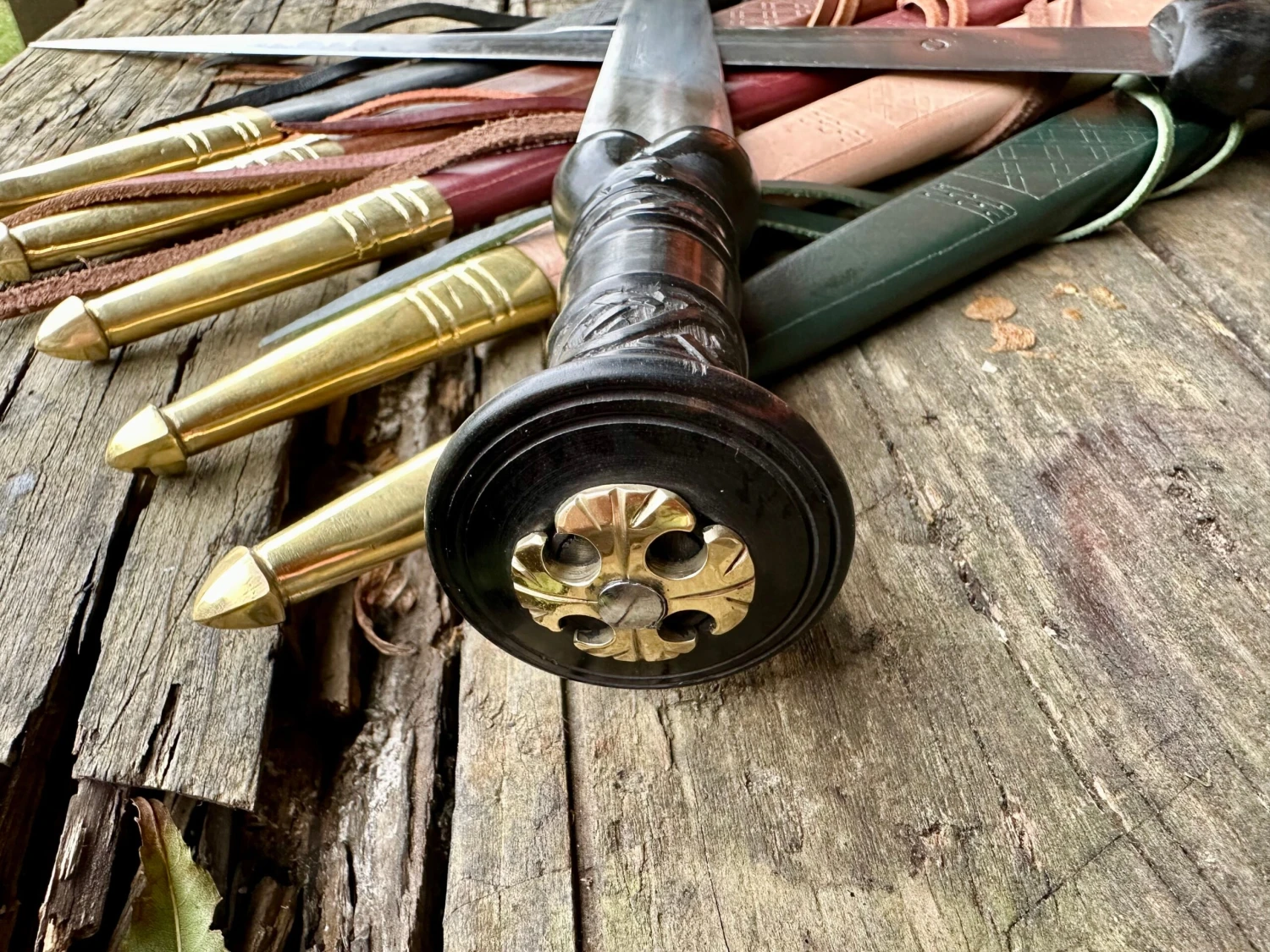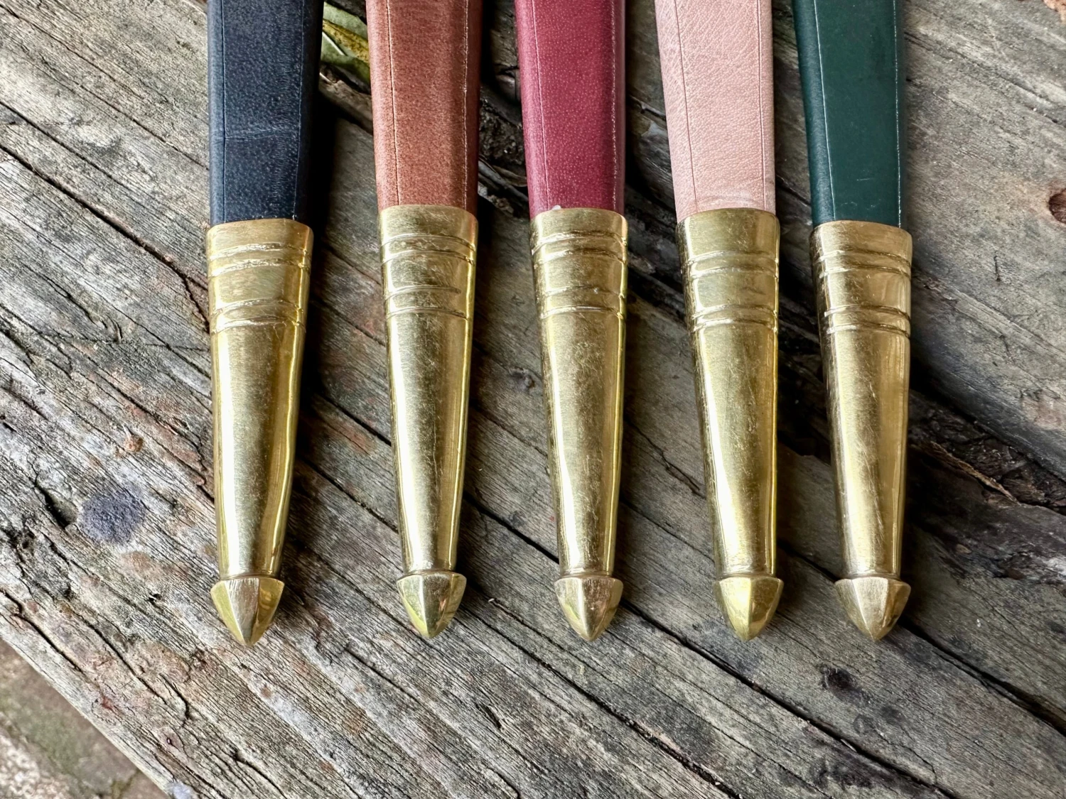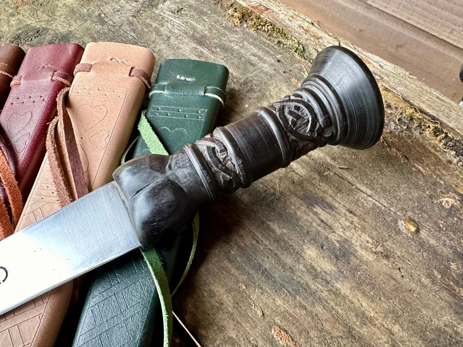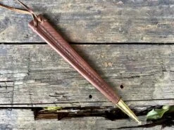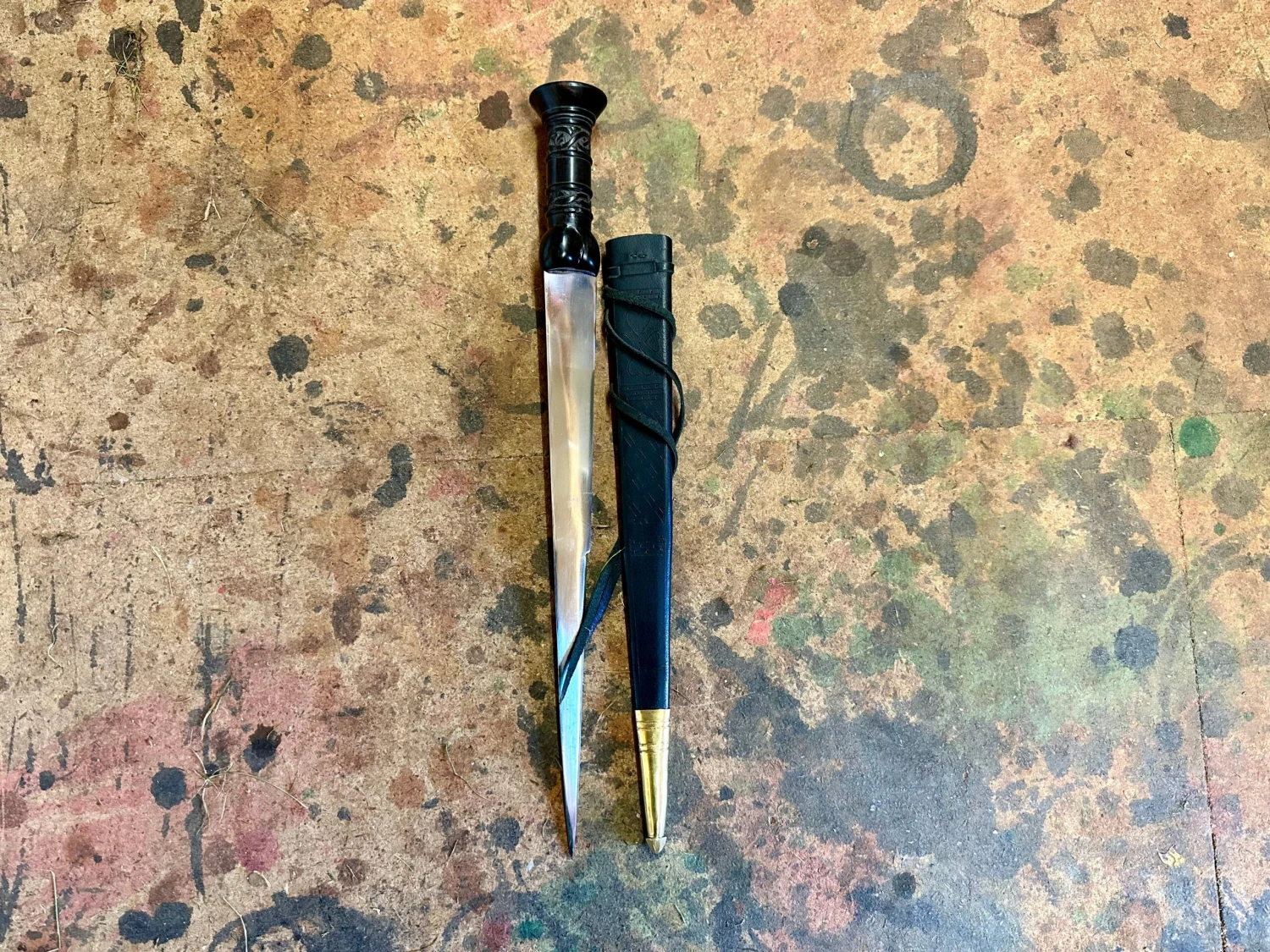 The dagger comes with a double layer leather sheath with a choice of sheath colour (Black, brown, red, green, natural) some incised decoration and a decorated brass chape.