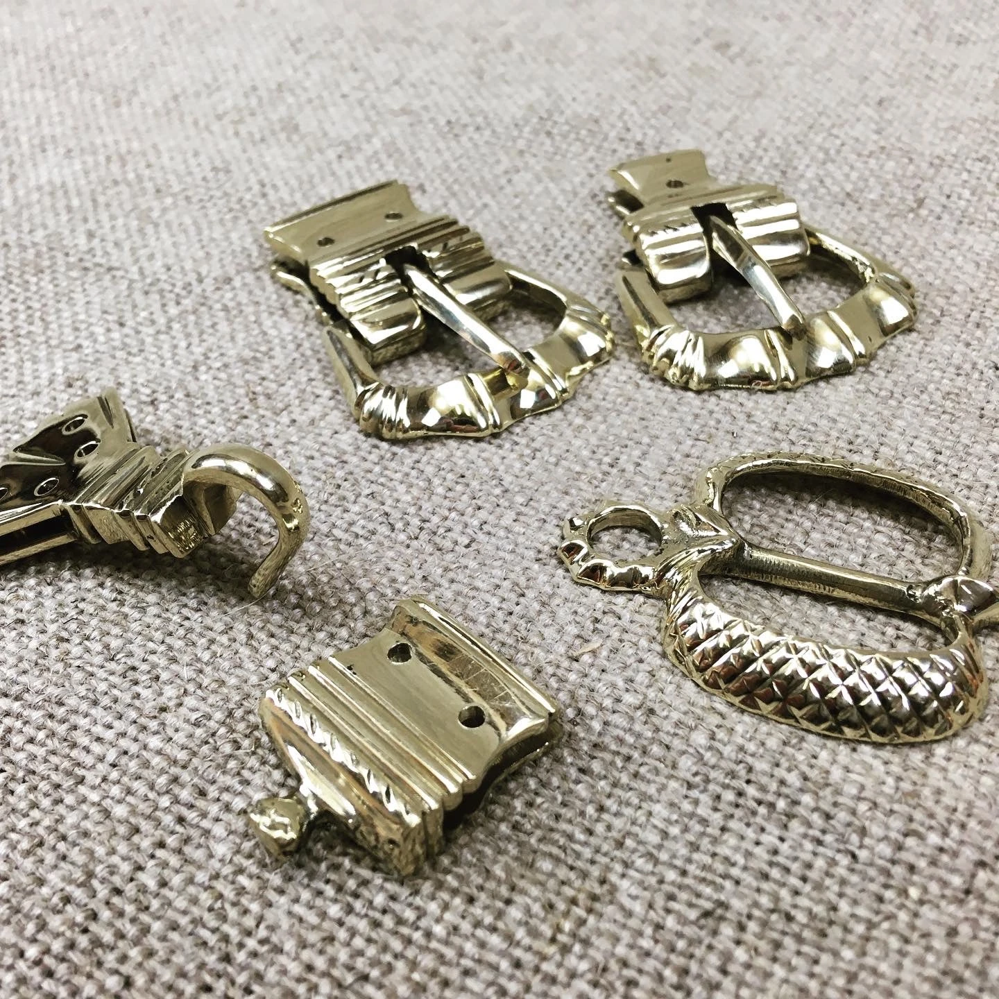 14th/15thC sword belt set and used for suspending longswords. All the metal parts for the belt and harness. Mounted on natural veg tan leather straps ready to have the last buckle fixed