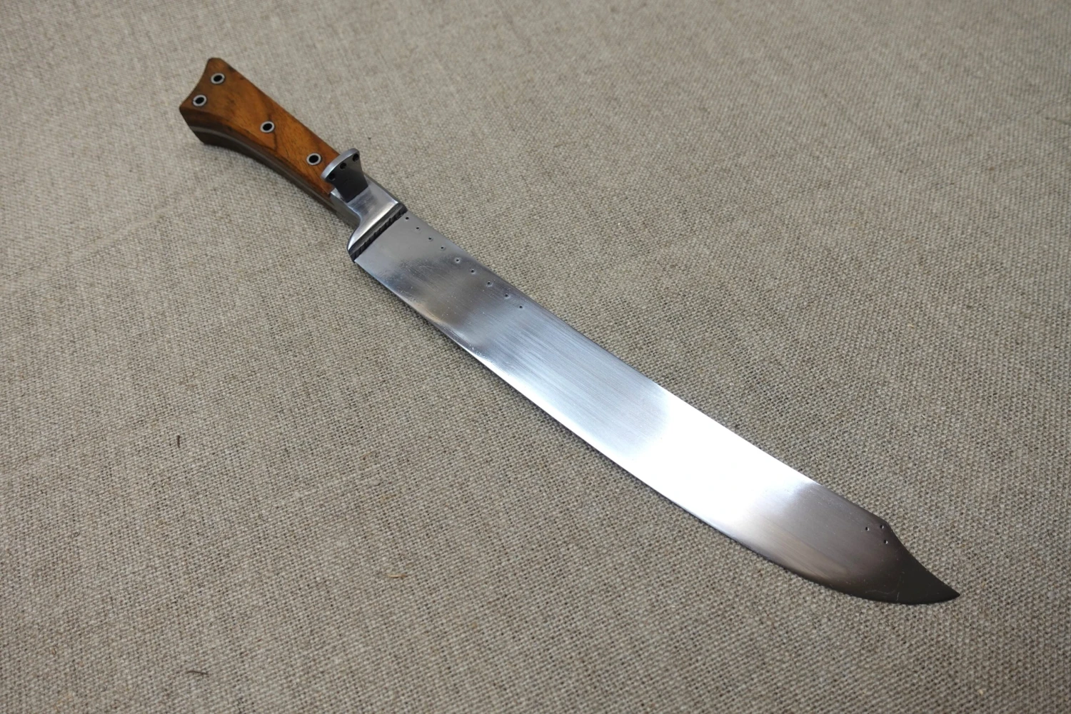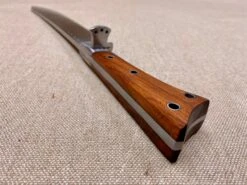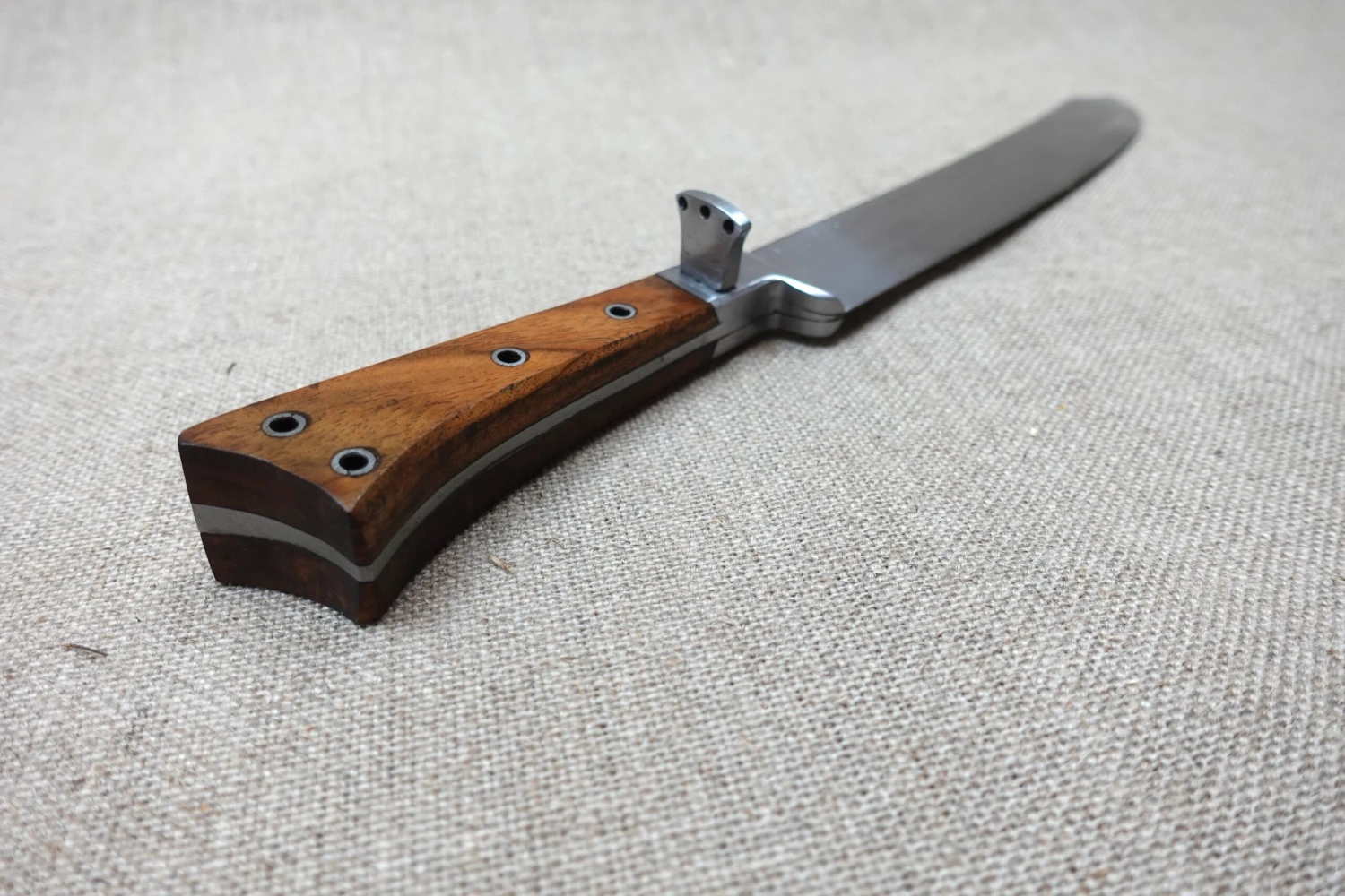 Steel fittings, hollow steel rivets wood grip panels and some decorative punching down the blade.