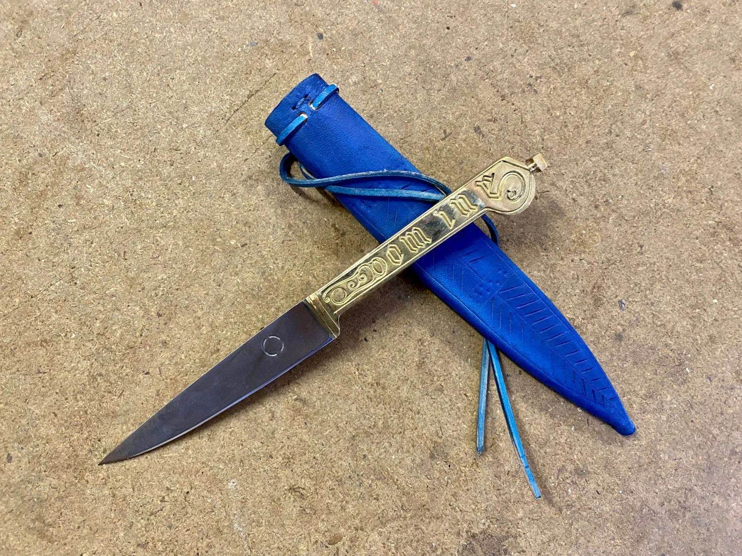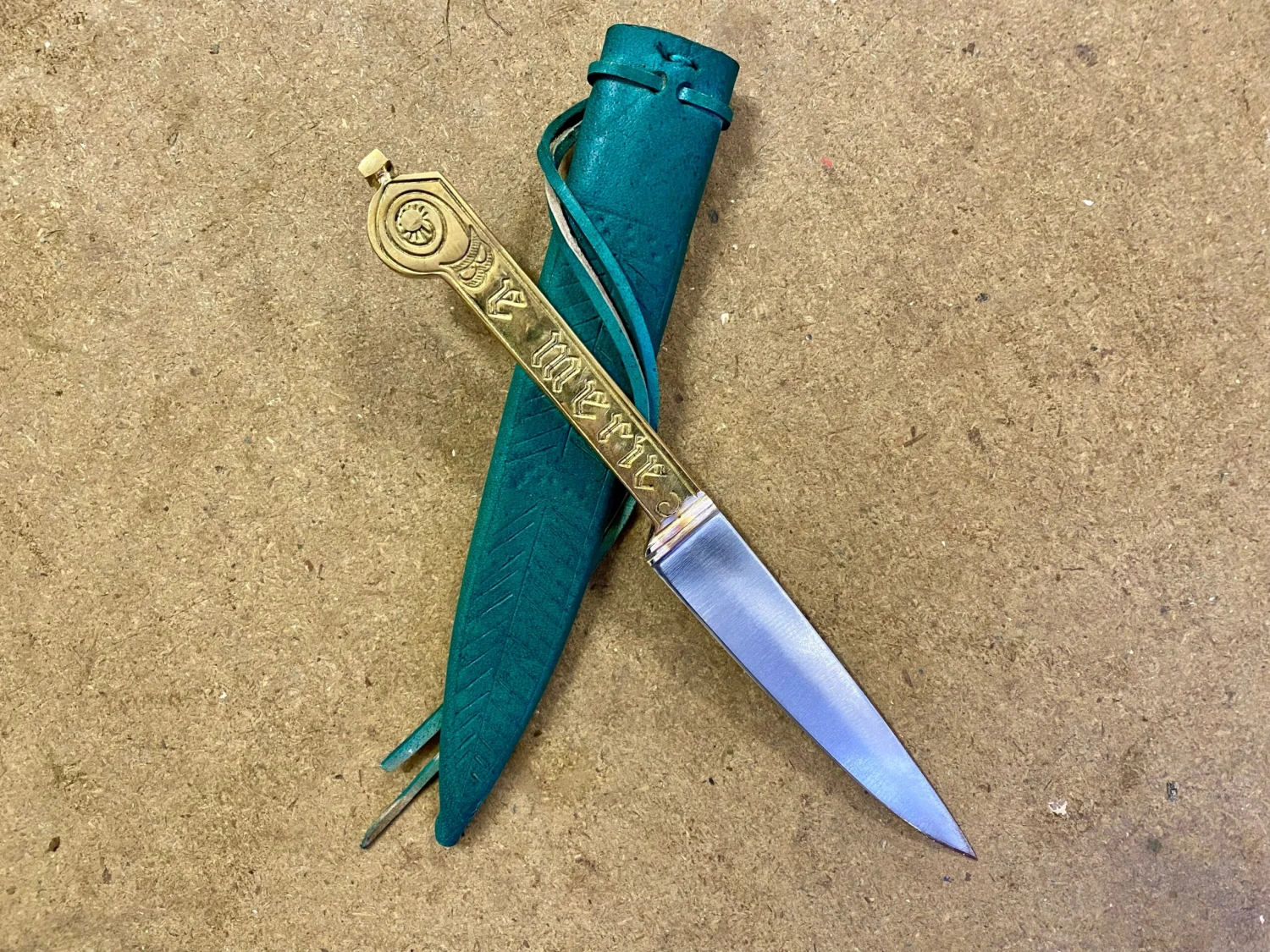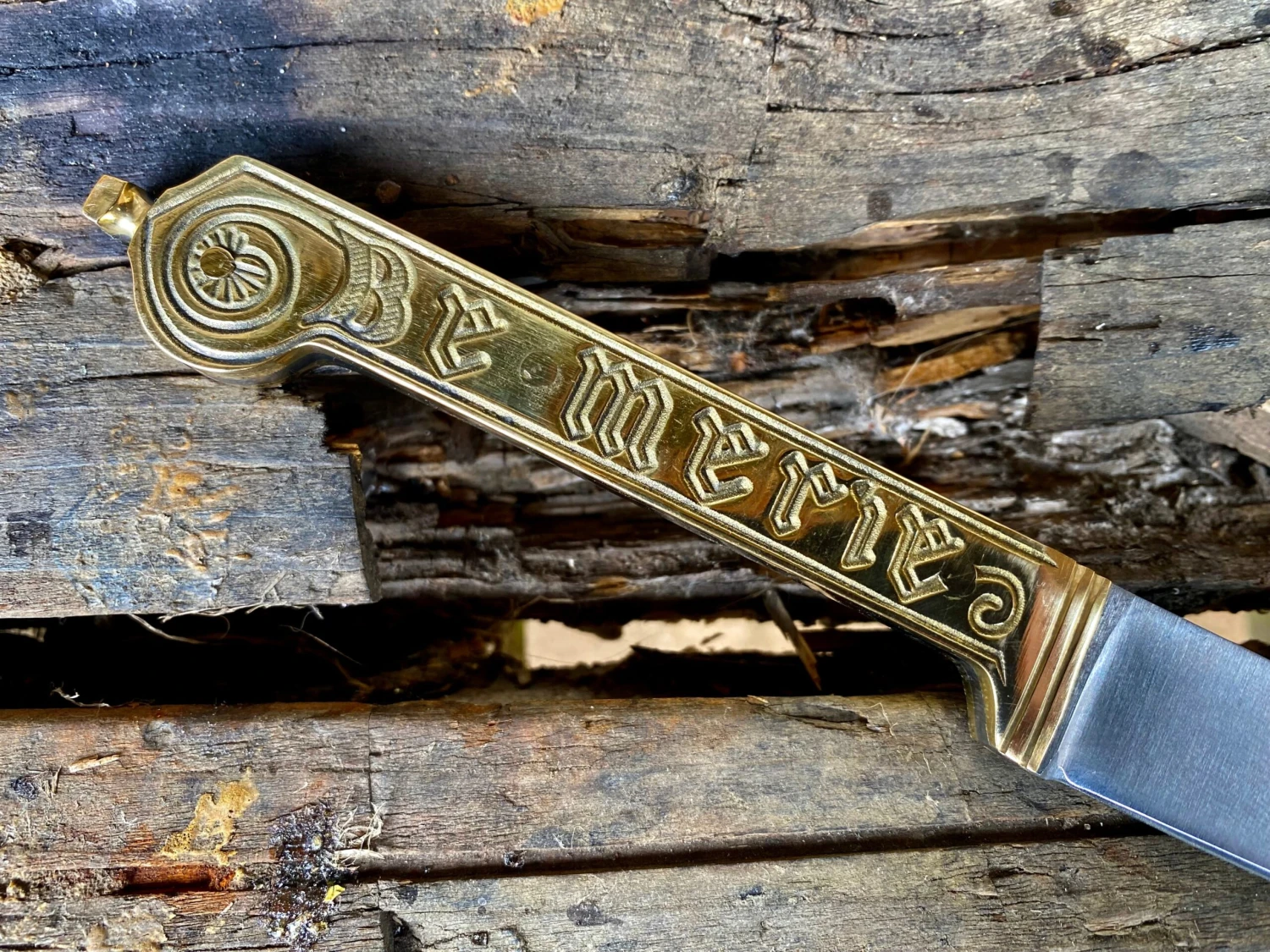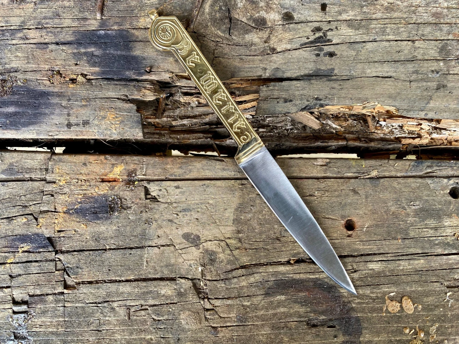 Beautiful medieval eating knife with decorated brass handle inscribed with ‘Be Merie’ on one face and ‘Domine’ (Our Lord) on the other. Both motifs were common. These were taken from a 14thC knife but these brass handled knives were popular from 13th through to the 16thC