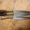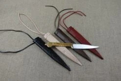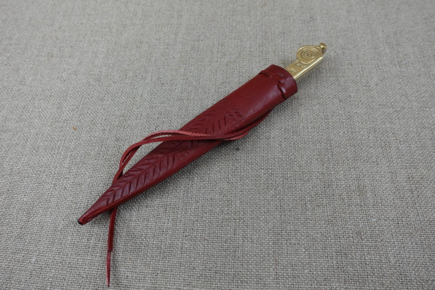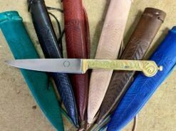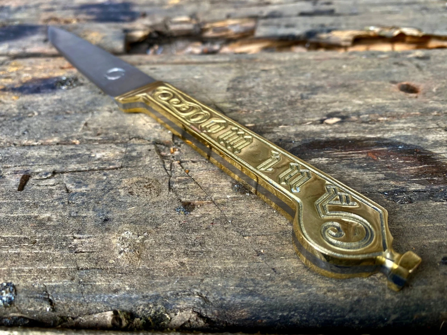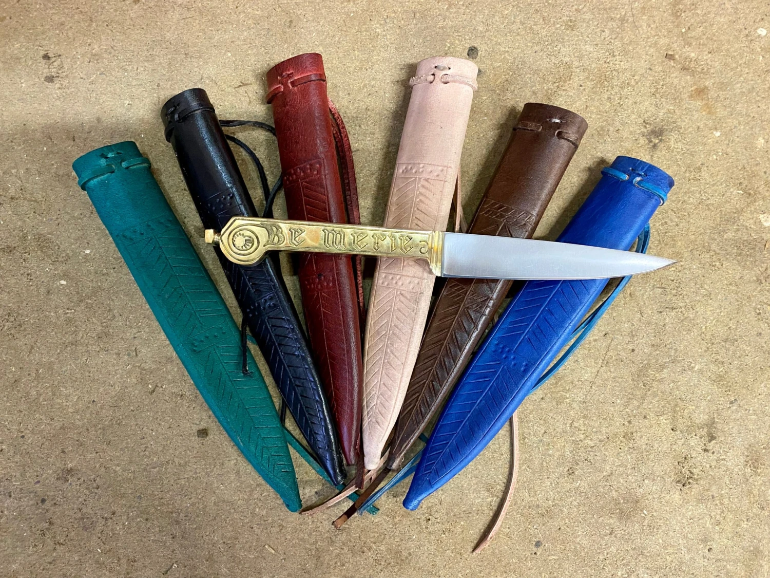 Beautiful medieval eating knife with decorated brass handle inscribed with ‘Be Merie’ on one face and ‘Domine’ (Our Lord) on the other. Both motifs were common. These were taken from a 14thC knife but these brass handled knives were popular from 13th through to the 16thC