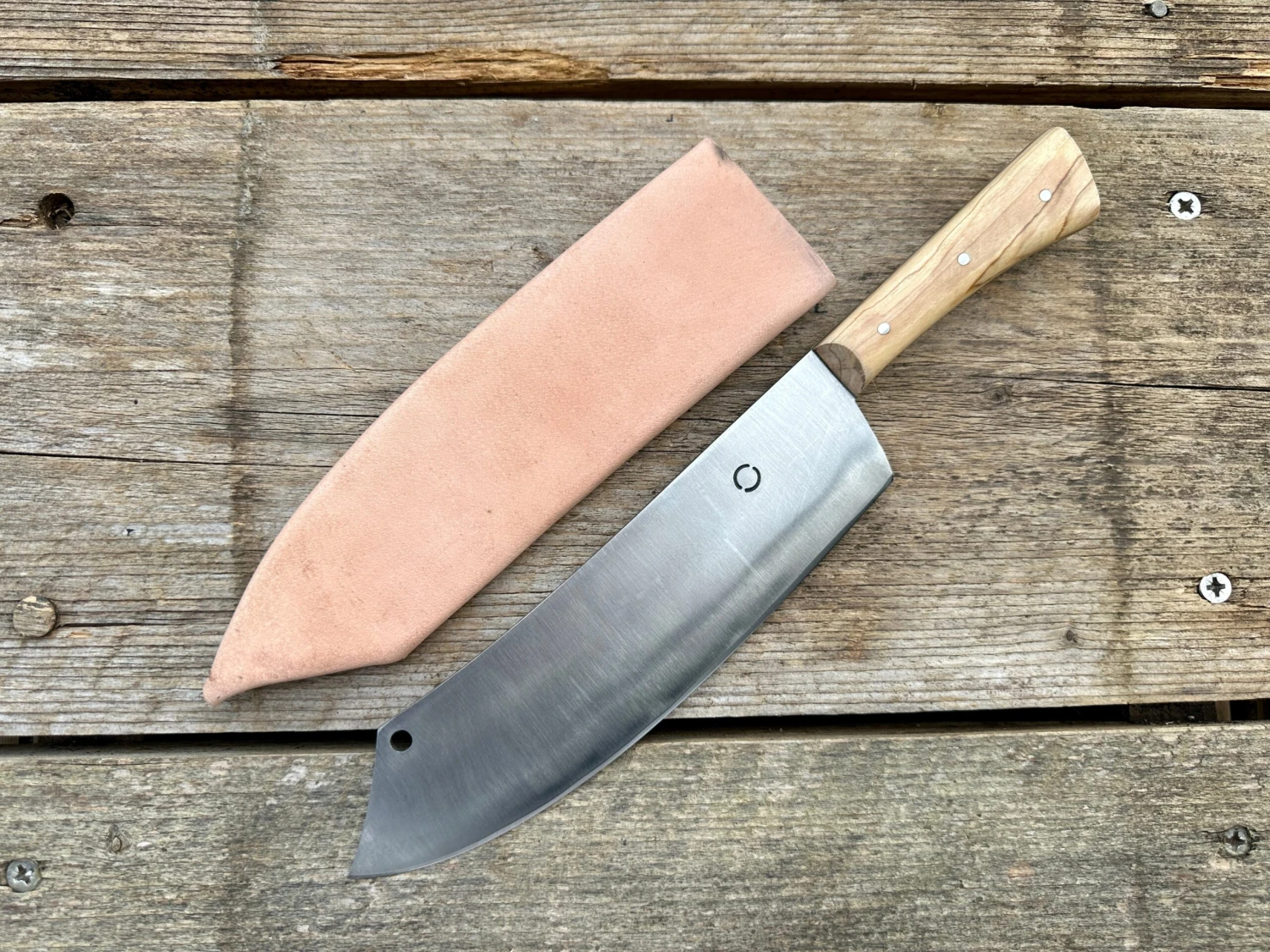 Carbon steel blade, ash grips and a natural veg tan leather sheath for safety.
