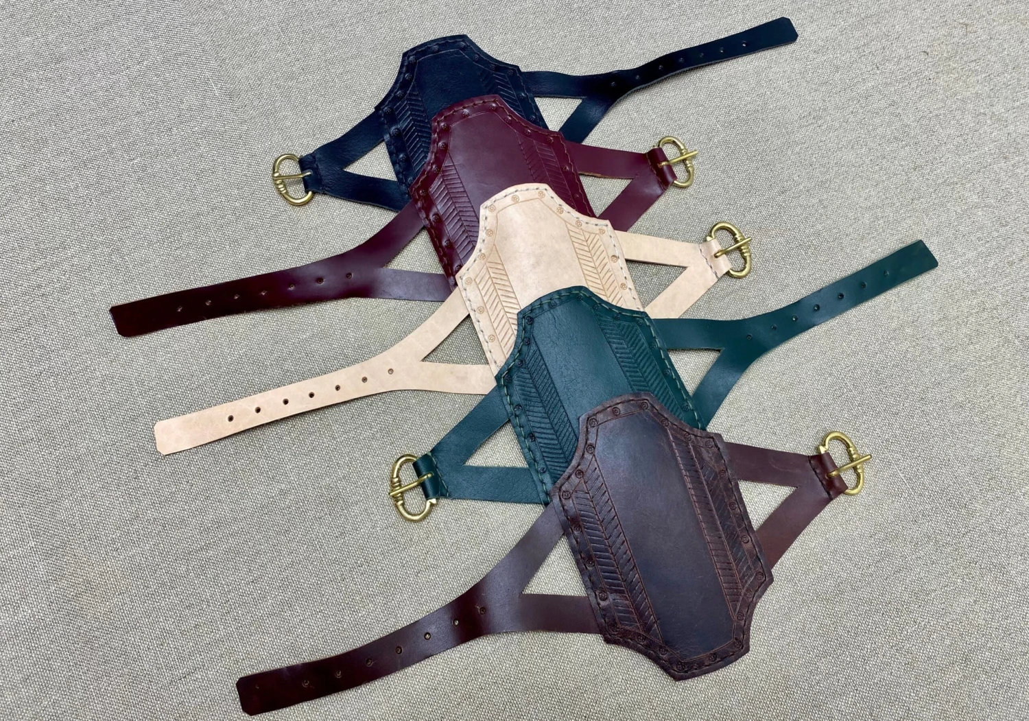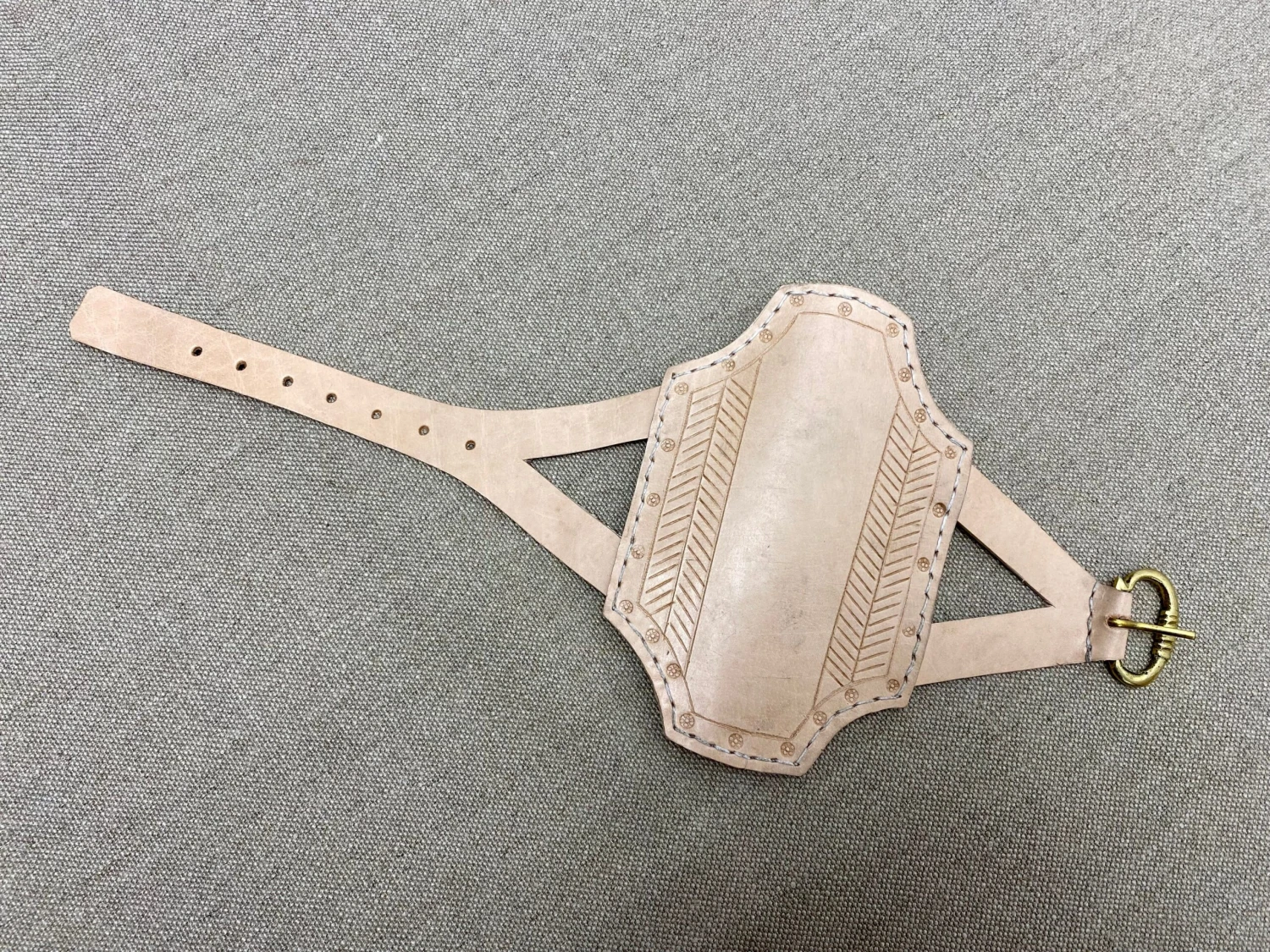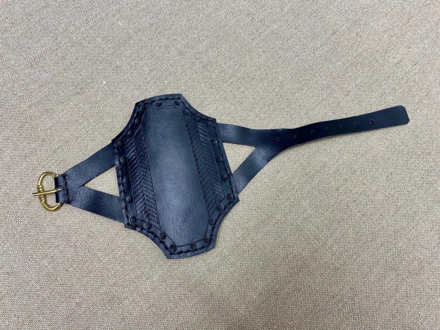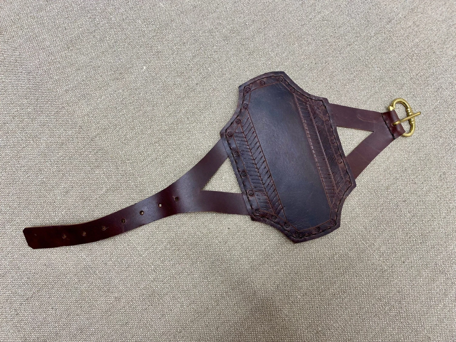 Distinctive Medieval shaped rectangular 15thC bracer made with two layers of bonded and stitched vegtan leather 4.5mm thick, 15cm/6” long.