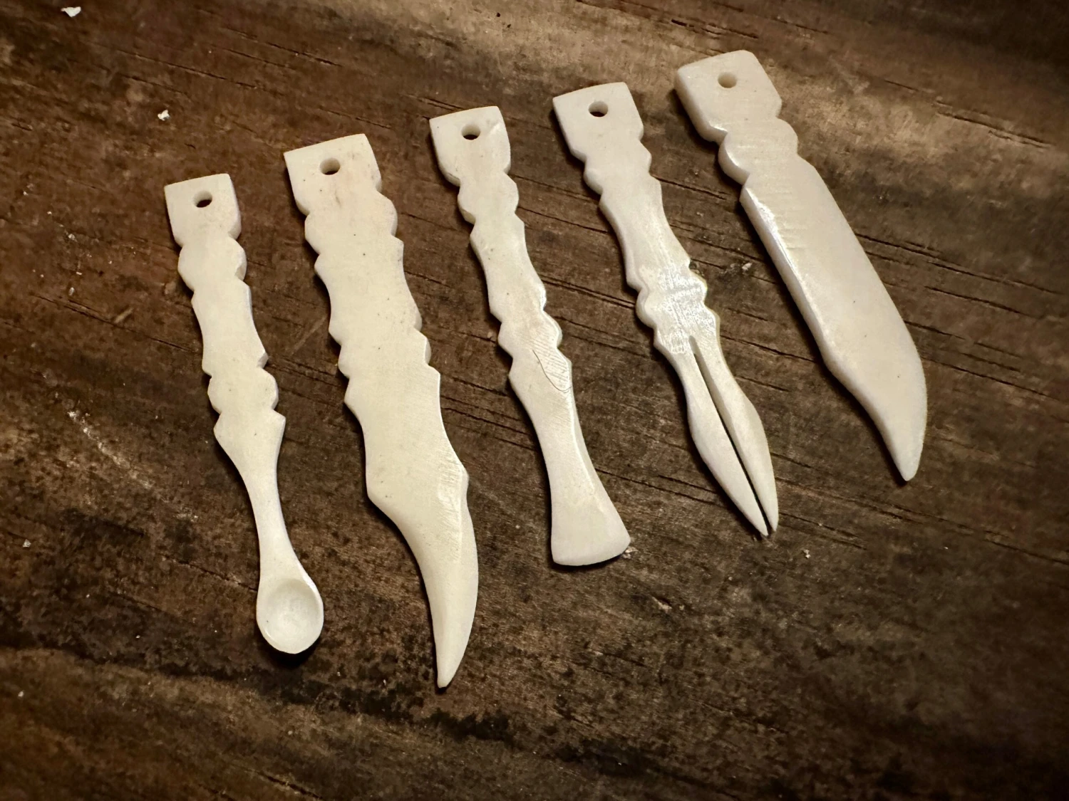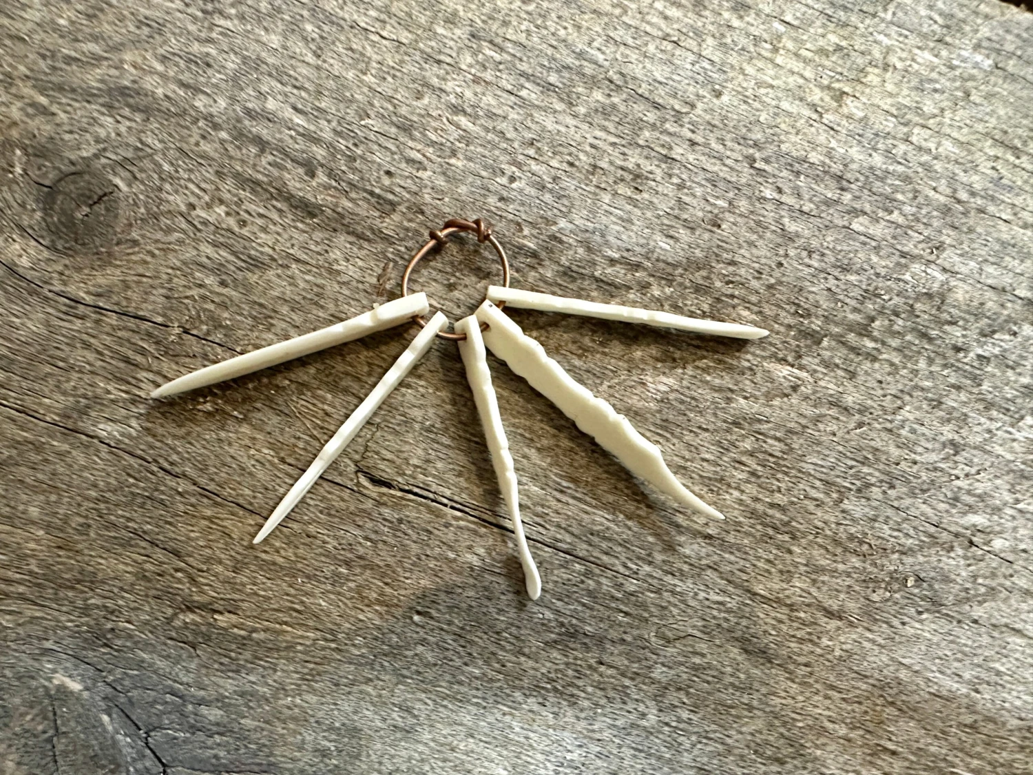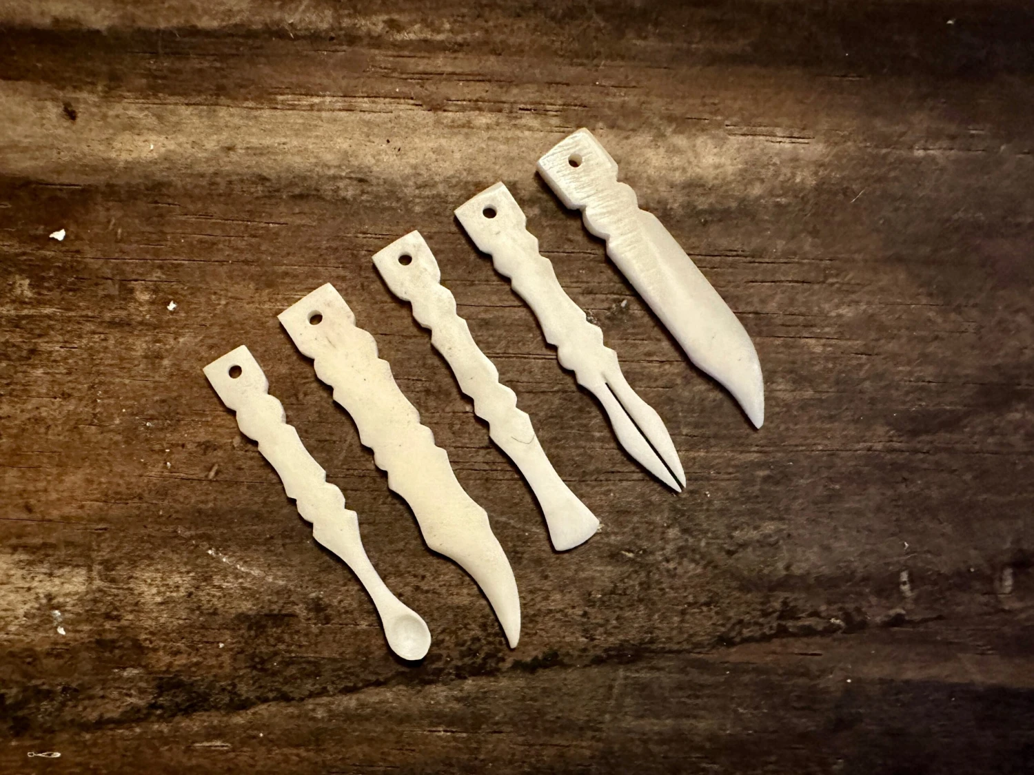 Contains a bone ear scoop, tweezers, cuticle pusher and nail cleaner which can be tied together with a piece of cord, wire or chain (not provided)