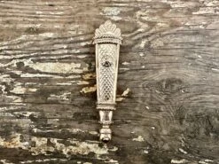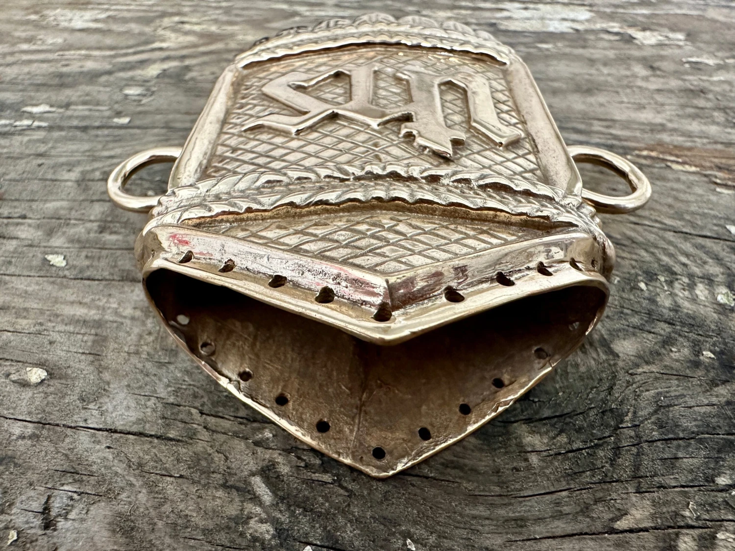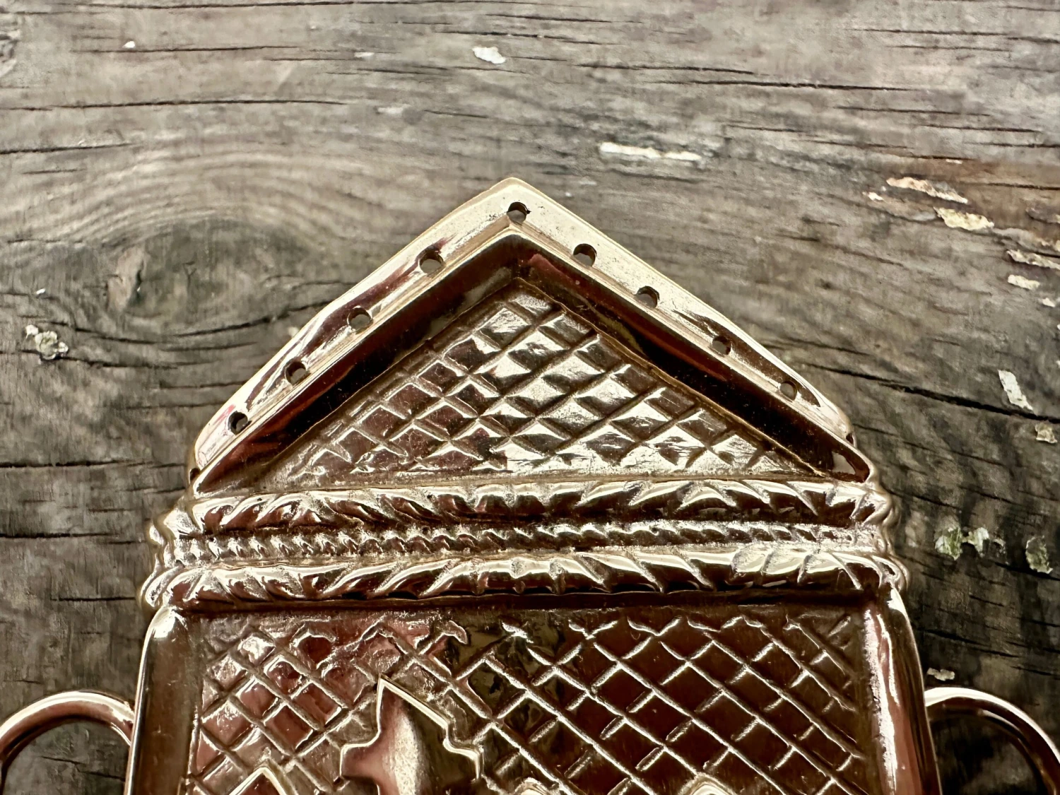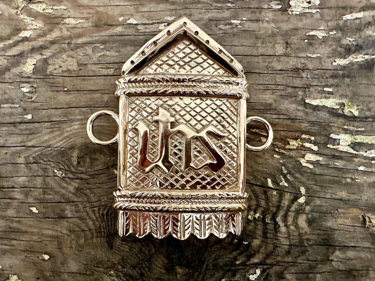 Scabbard fittings based on those of the Dennington Effigy, so suitable for around the year 1400. These belonged to a relatively affulent Knight and were fitted to a longsword, shown veritcally as they so often were. Cast in bronze with the IHS monogram. Top of the throat fitting is set up to accept a triangular rain flap.
