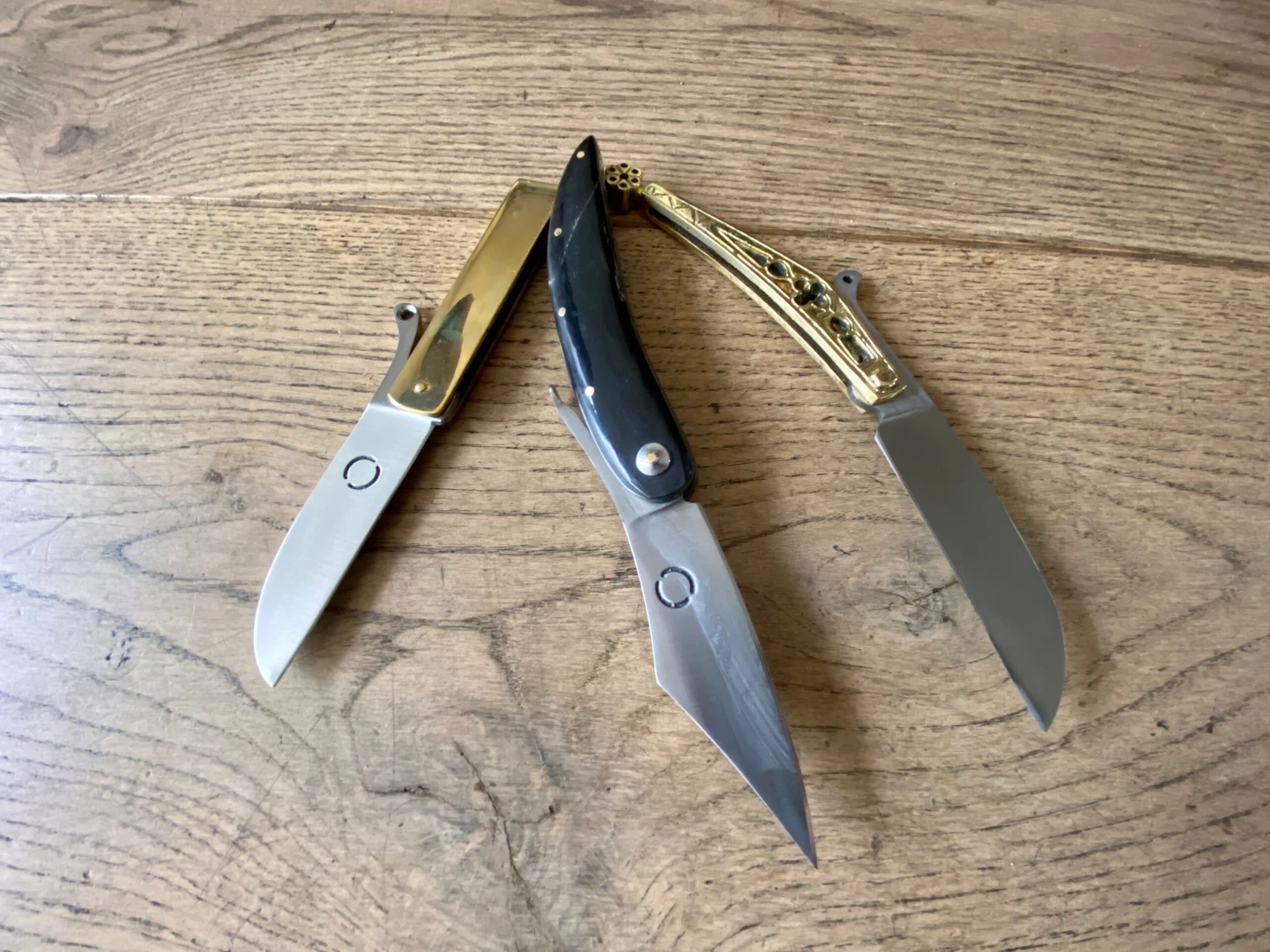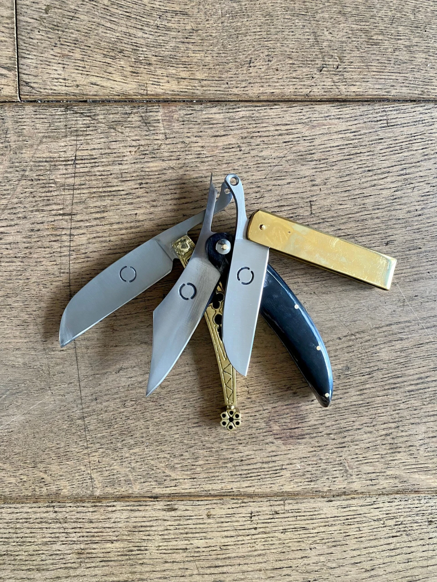 A very easy to make, low status, utility, folding knife. Ā Solid brass case, hollow ground straight edged blade that can be used as a razor. Ā Although, whether or not this was used as a razor or just as a folding utility knife we do not know. Ā Blade is carbon steel and held open with a thumb tag which was the standard way until the 17th C.