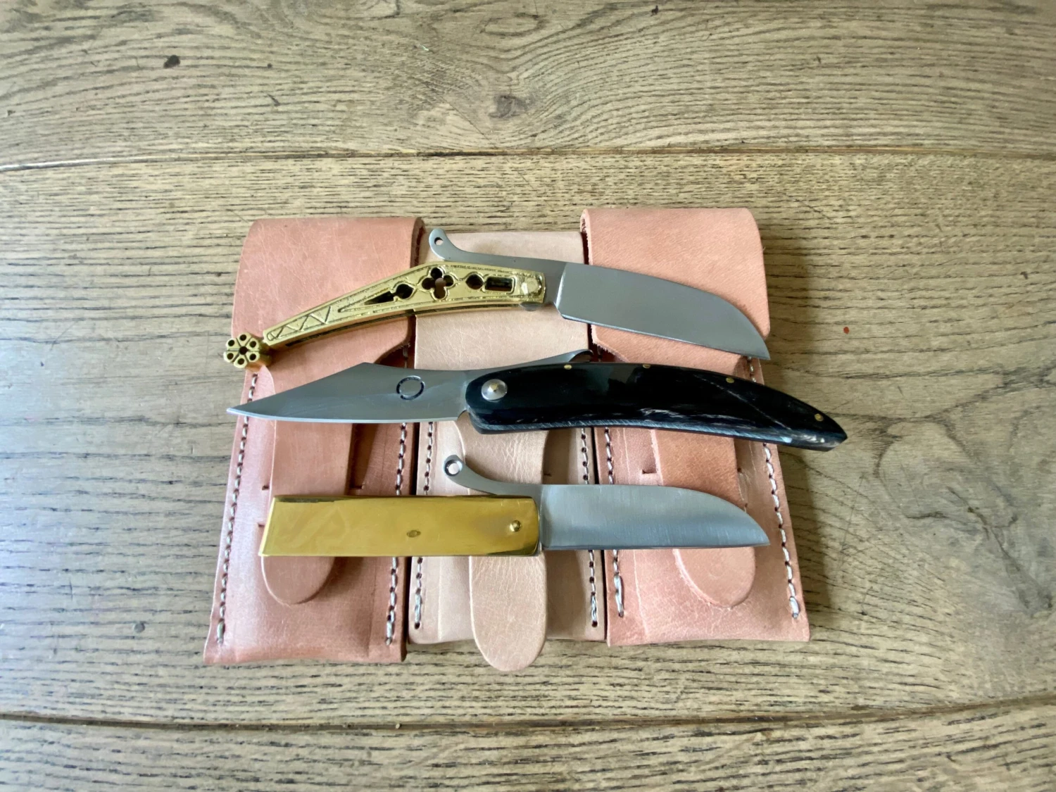 A medieval folding pocket knife or razor fitted into a brass āGothicā handle and held open with a thumb tab.Ā Copied from a Thames River find. Comes with natural veg tan leather sheath. As do all the folding knives.