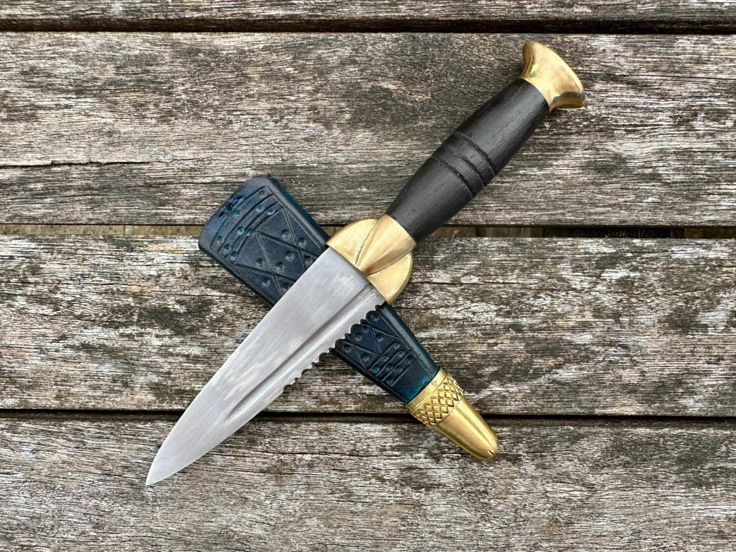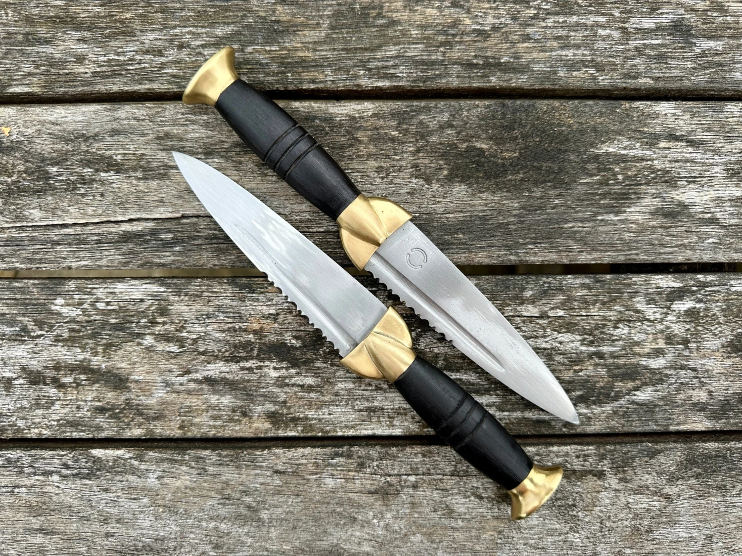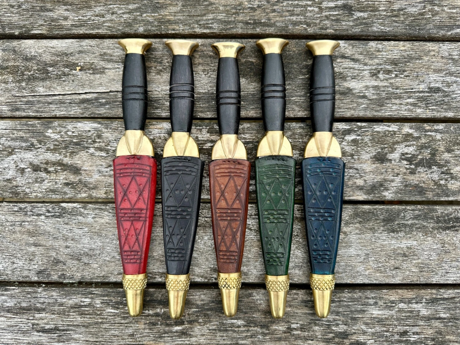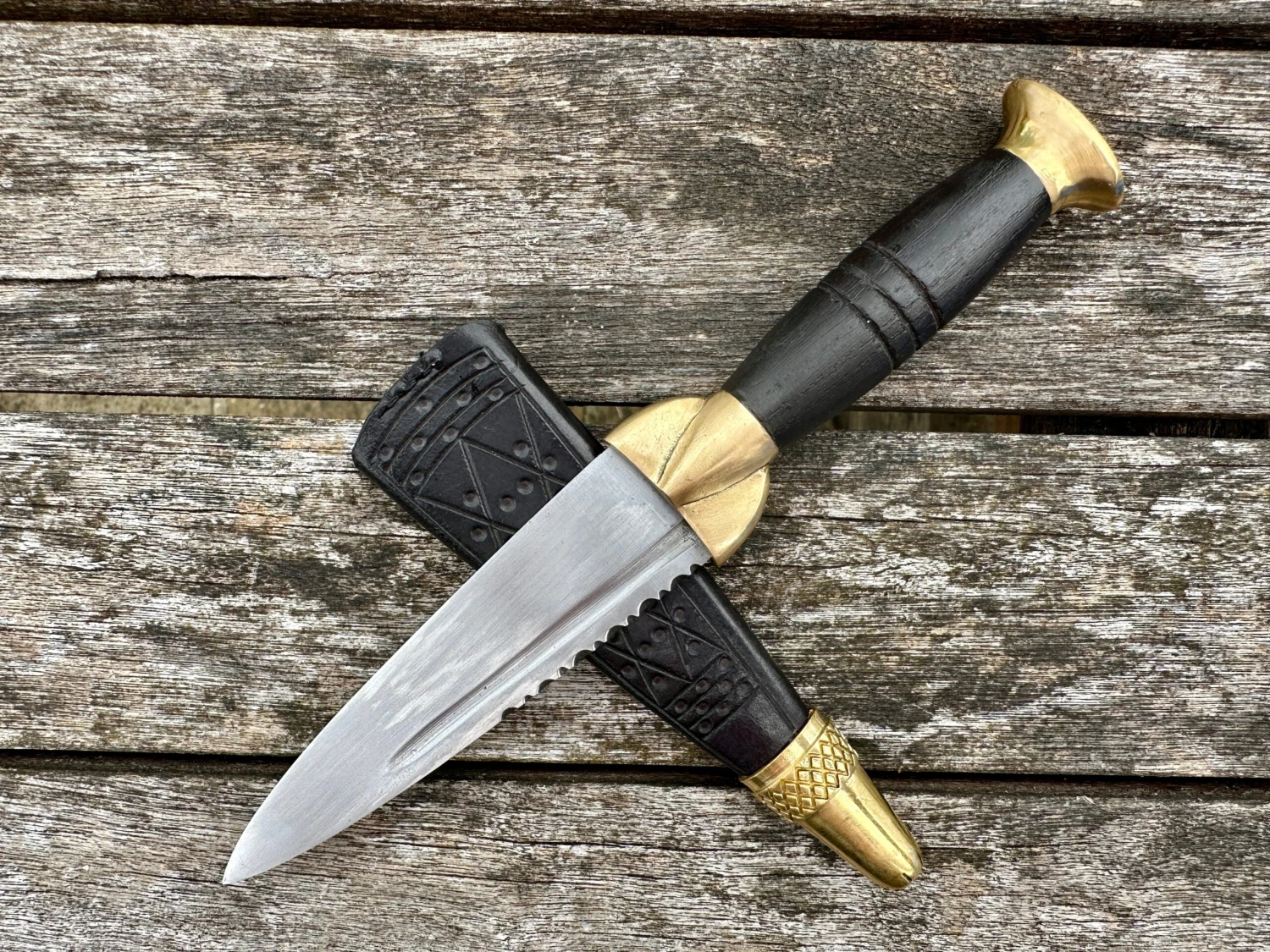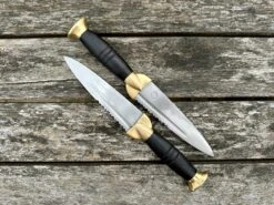 We have 3 sizes of this style; the Sgian Dhu, the short brass and black wood dirk, and the long brass and black wood dirk. ย Available individually or as a set.