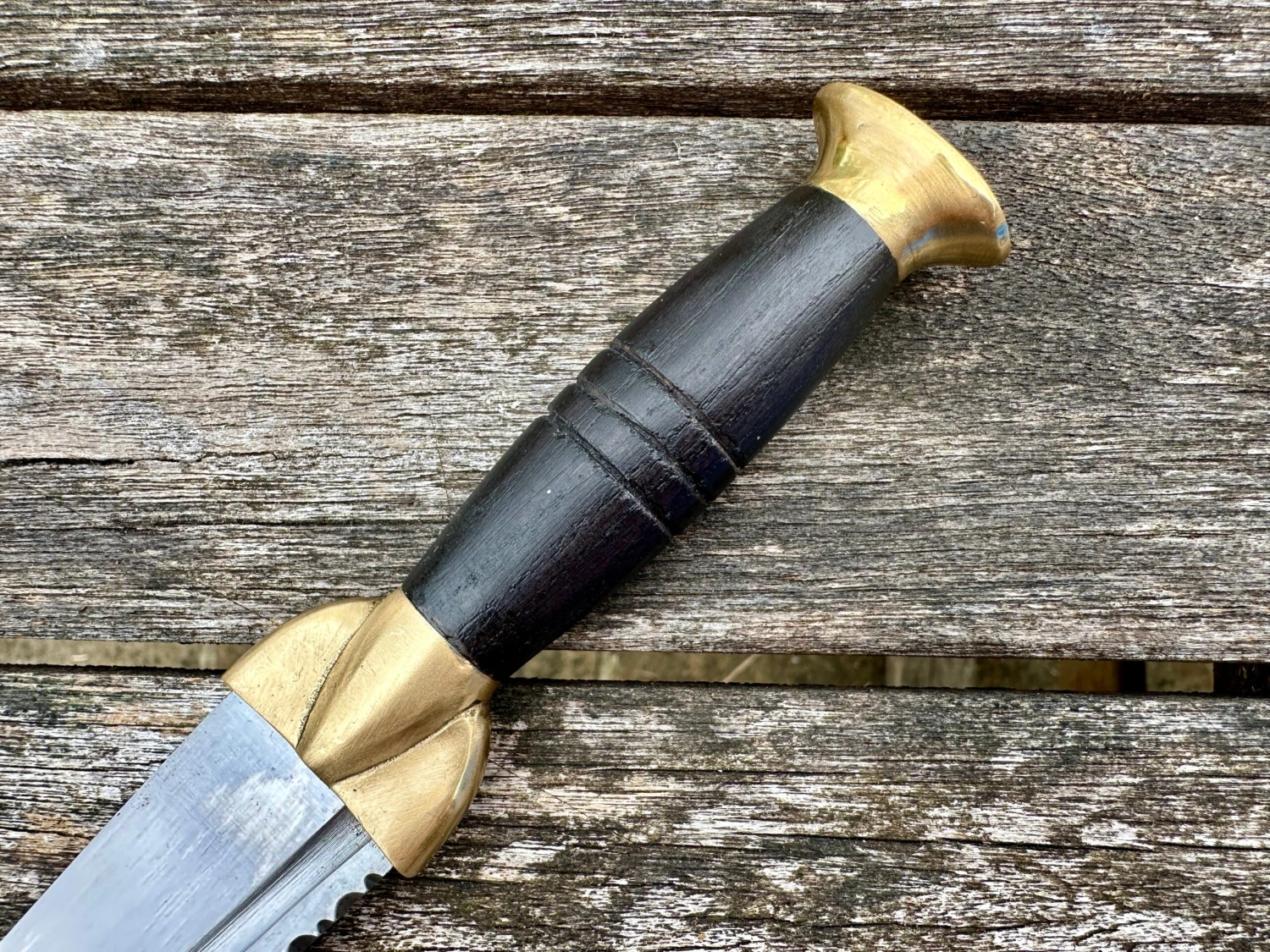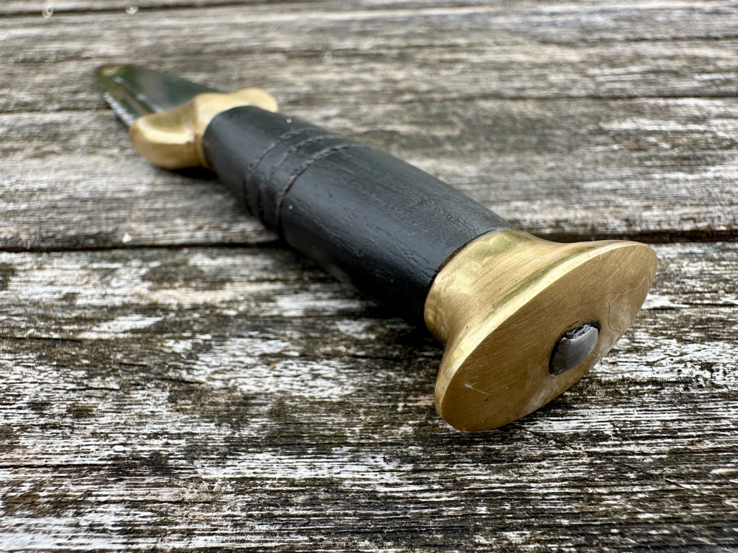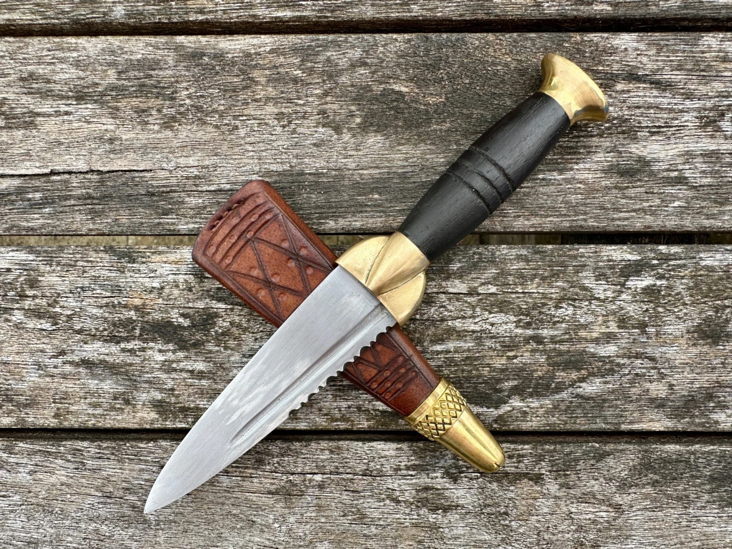 Our Sgian Dhu is a reduced version of a full size late 17thC/early 18thC Scottish dirk, the true fighting knife of the Scots, so IF the Sgian Dhu existed, it may well have looked very much like this. ย Brass haunches, a black wood grip and flattened brass pommel so it looks all ‘dirk’ but will sit close and comfortably to your body when worn in a sock.