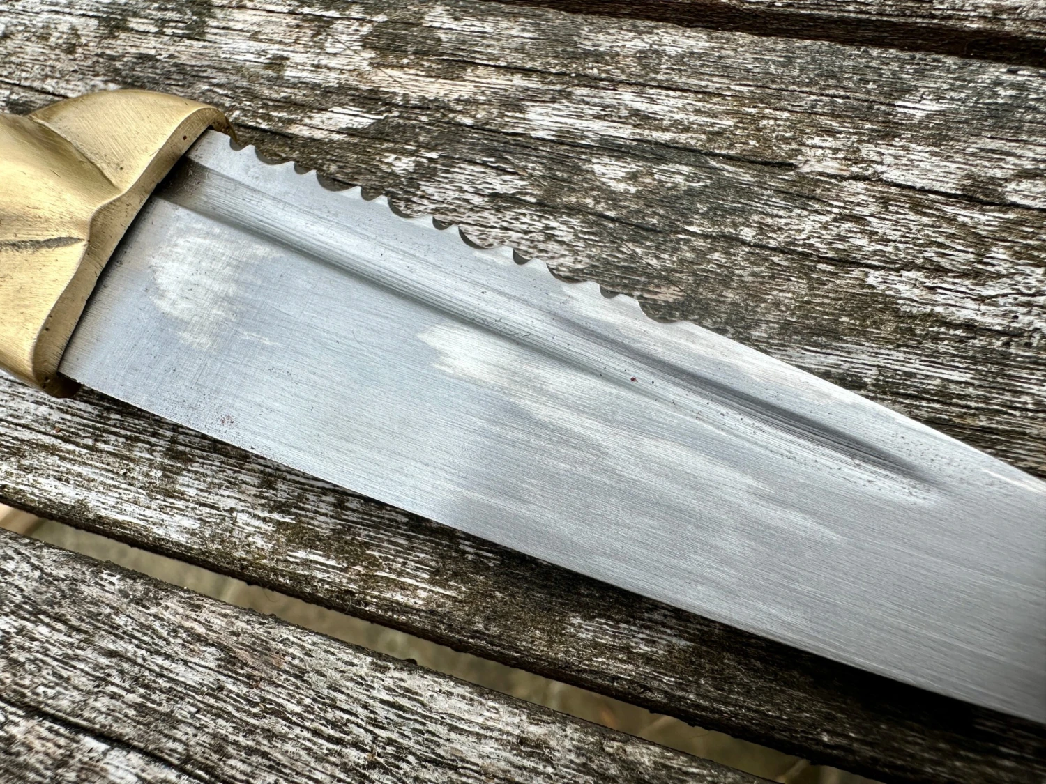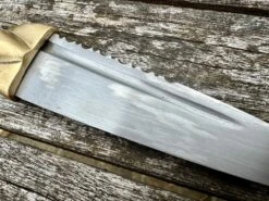 It has a fully functional, single edged blade with file work spine and comes with a period decorated naturally tanned leather sheath and brass chape.ย