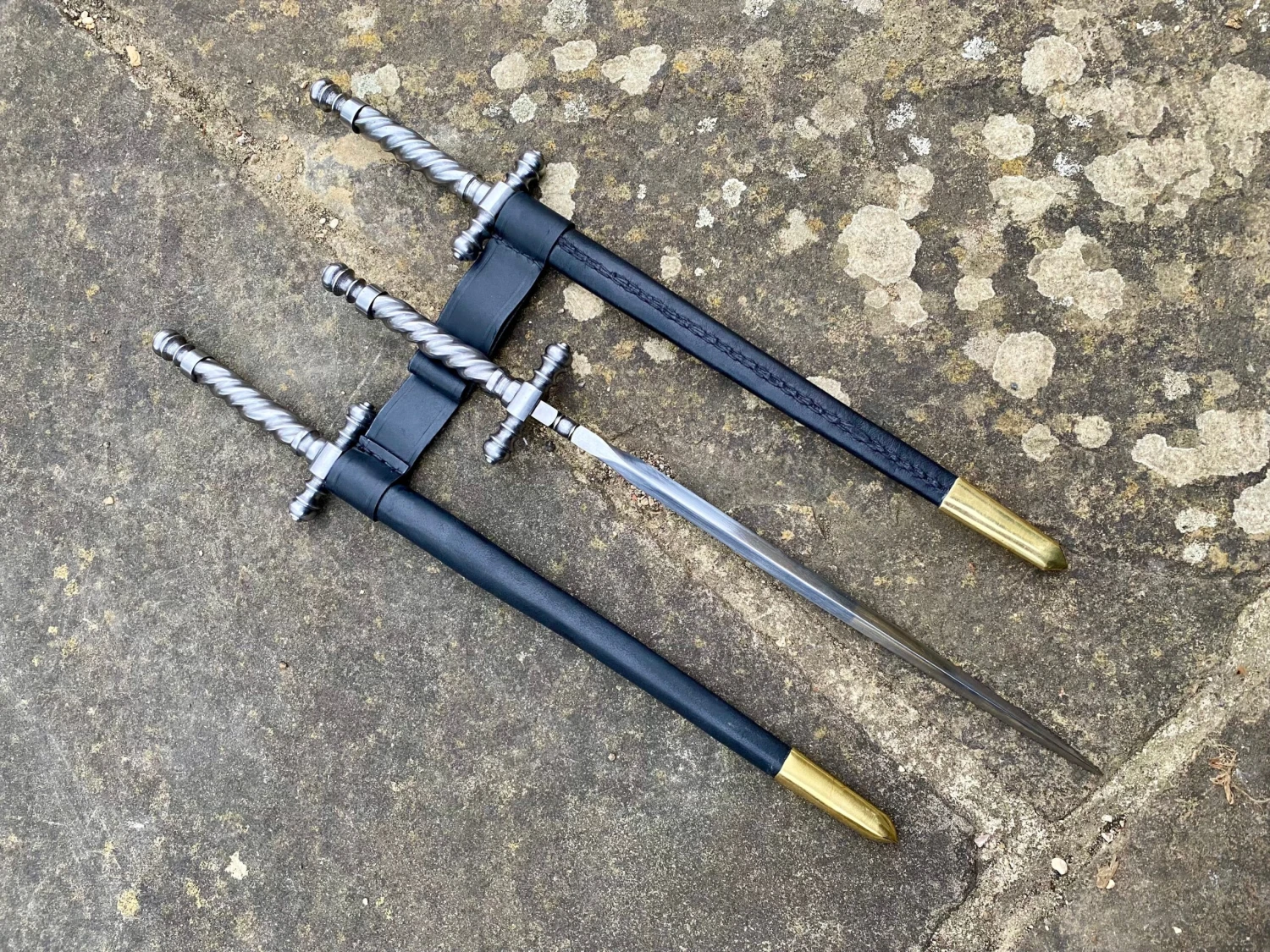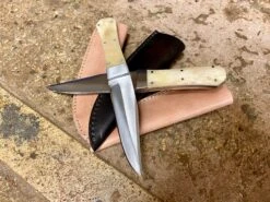 Steel grip and guards, steel blade, veg tan leather sheath.