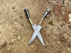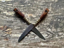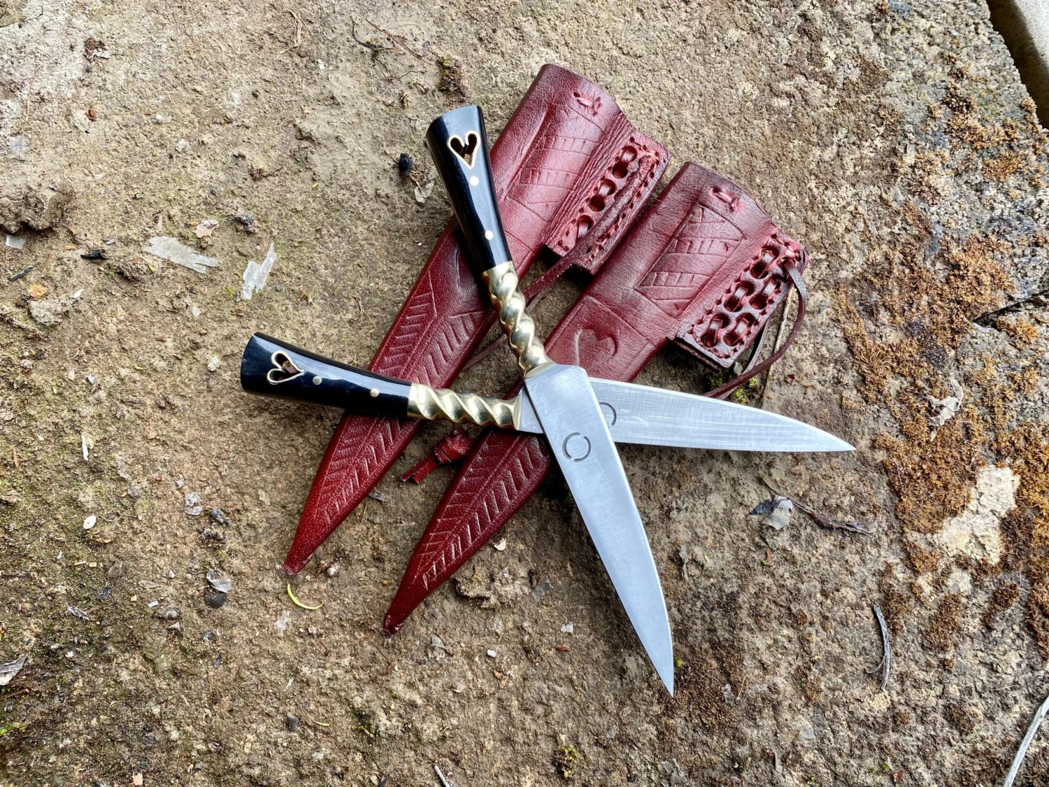 These medieval eating knives are based on a composite of historical examples from the 14thand 15thC.ย The carbon steel blade is stamped with a makers mark and has a carved brass bolster and black horn grip scales, notably punched through with a cut out heart lined in brass. NOW also available with dark wooden or olive wood grip scales.