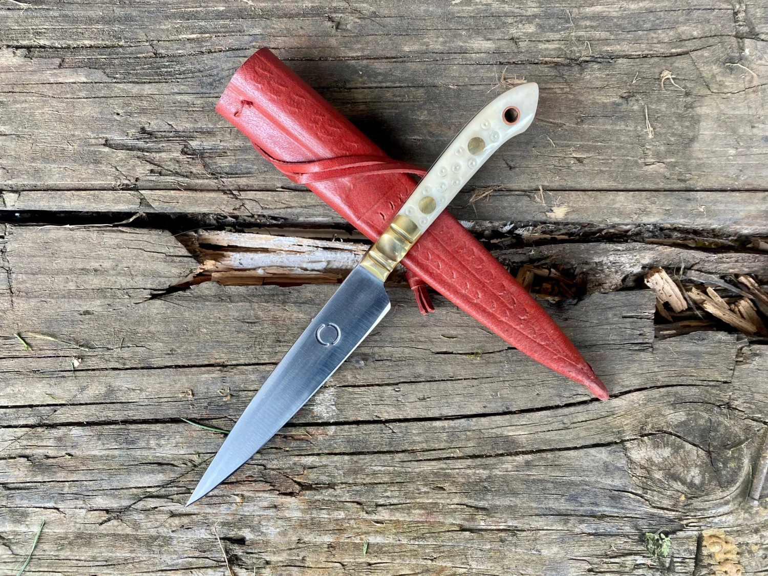 Brass bolsters, bone handle scales with dot and circle pattern, brass and copper rivets and veg tan leather sheath.