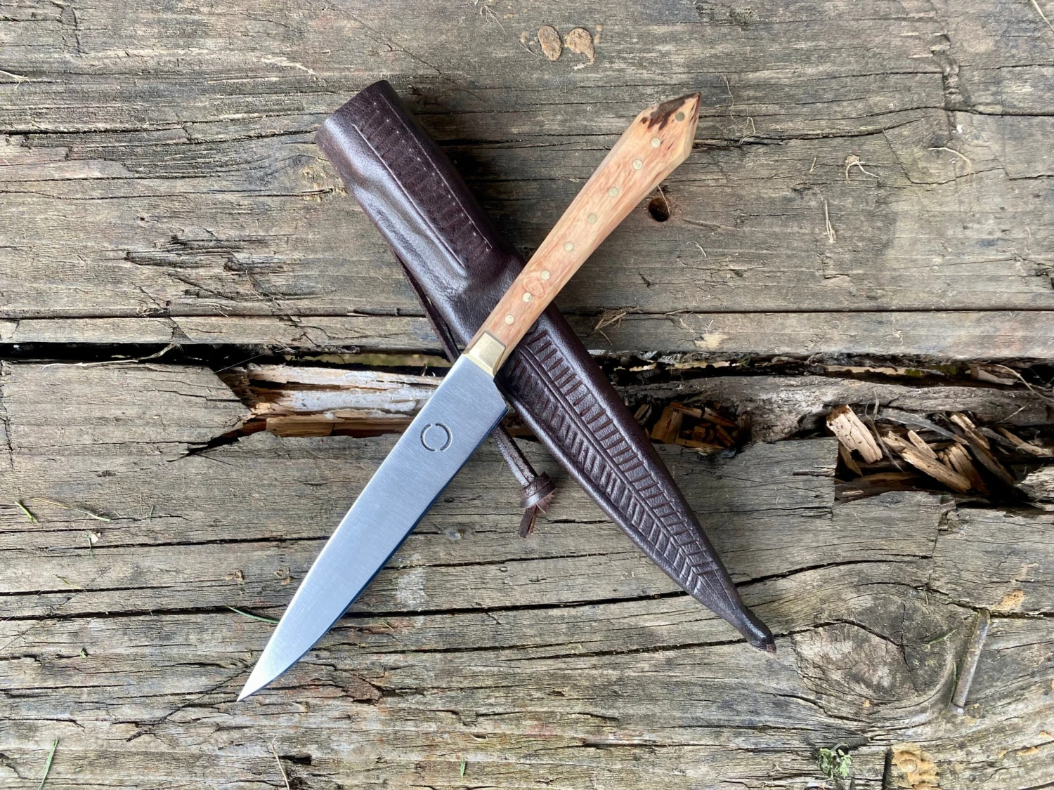 Wood handle scales, bronze bolsters, carbon steel blade and decorated veg tan leather sheath.