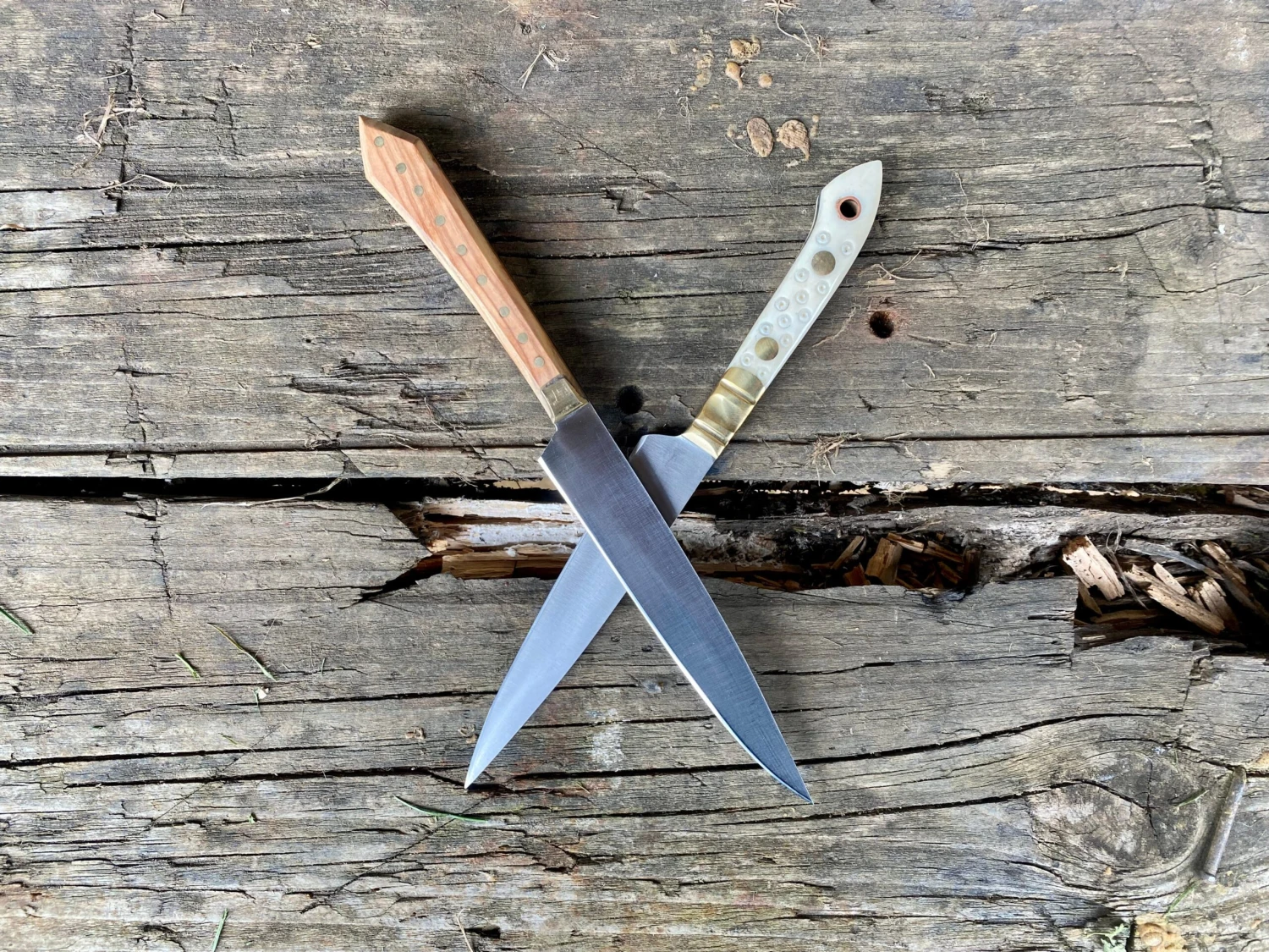 Both eating knives are suitable for 14-15thC Middle and Merchant Class reenactment but are quite different in appearance with one having a wooden scales and the other, dot and circle patterned bone.