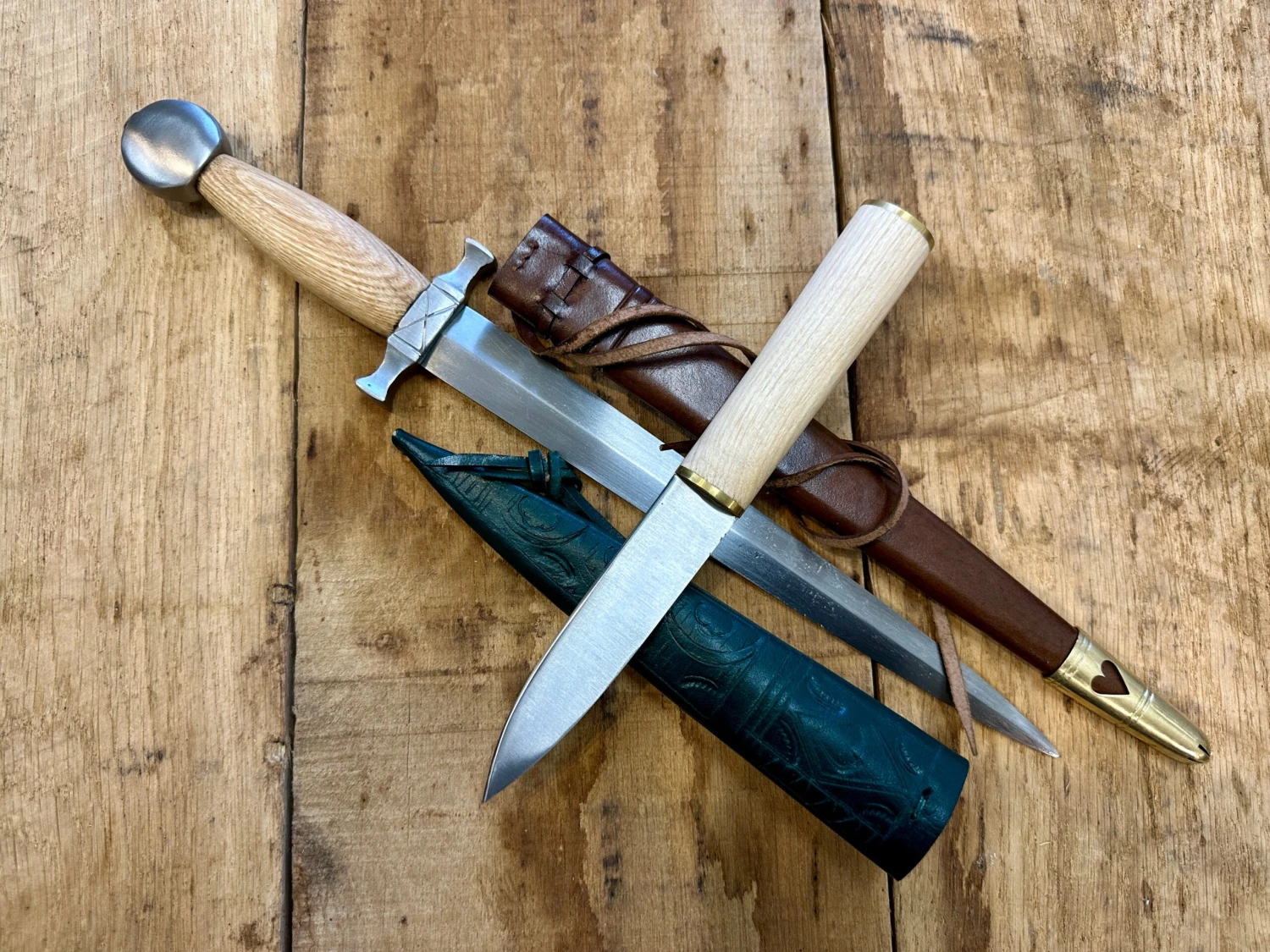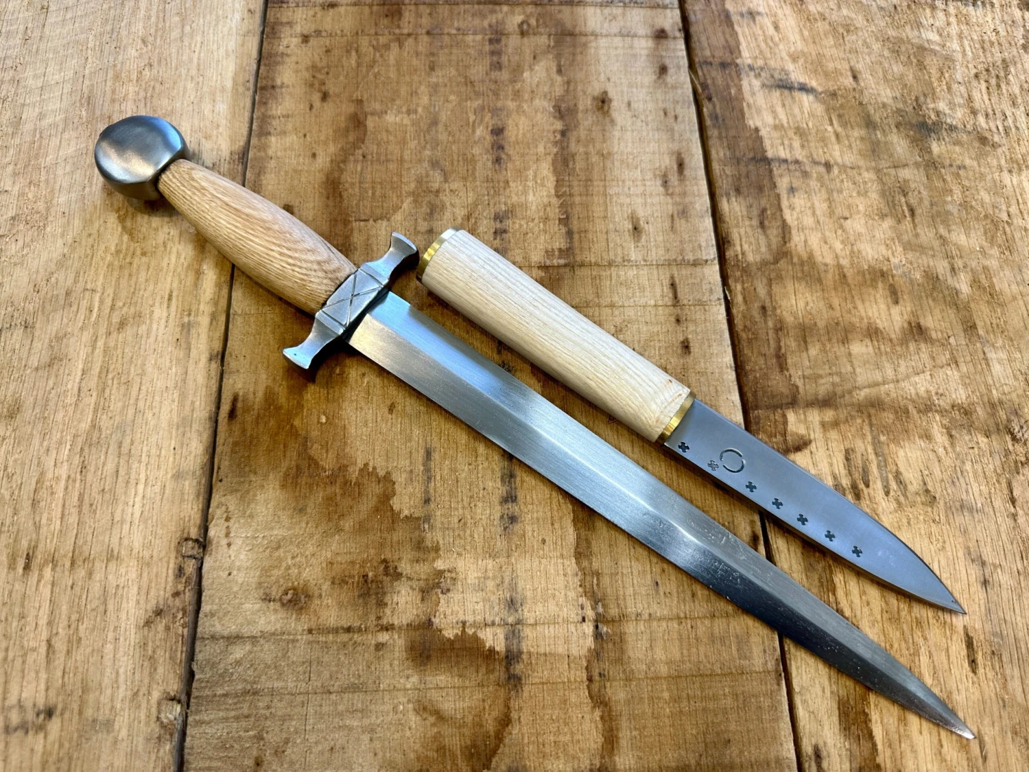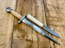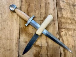 Daggers started as knights daggers in the high medieval period and quickly became popular with regular soldiers and men at arms. This medieval dagger is an early version and was the height of fashion in the 12thC and features a stout double sided blade fitted to a simple steel guard and pommel with an Ash wood grip. Stylistically they are similar to swords of the period and this example is based on an English piece, but this style of dagger fits all over Northern Europe.ย