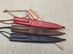 Wood handle scales, bronze bolsters, carbon steel blade and decorated veg tan leather sheath.