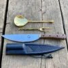 Wooden handle, brass rivets and grip liner, carbon steel blade, decorated veg tan leather sheath.